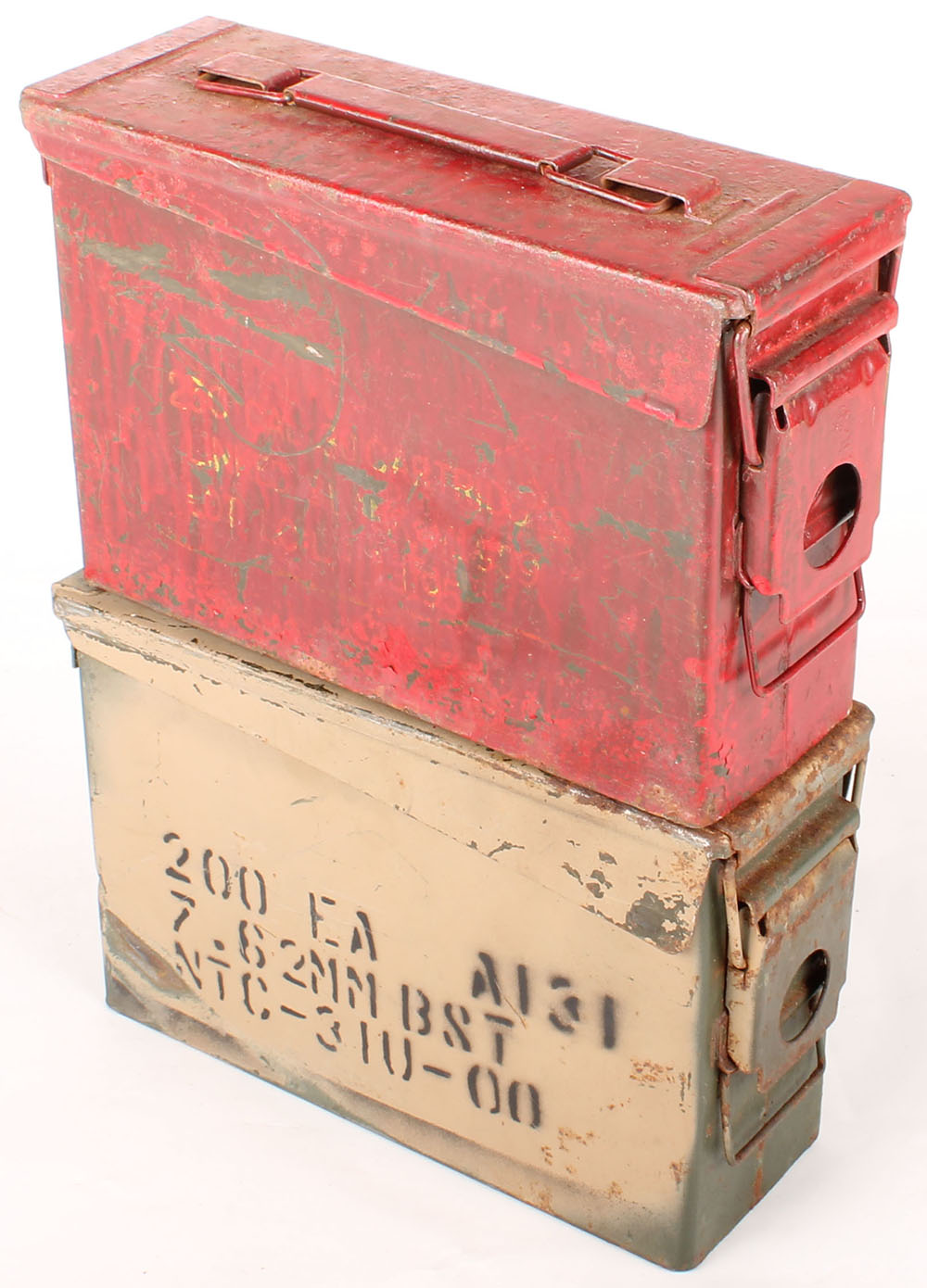 Lot of two, M19A1 .30 Cal metal ammo cans, both empty, insides of the red can has rust, the other is clean on the inside. Grade: Very Good - Value: 10 to 40