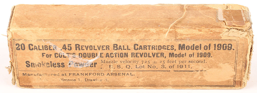 Frankford Arsenal, .45 Cal Revolver Ball M1909 (.45 Colt), Smokeless, Lot No.3 of 1911, 1pc, Full, buff box & label with black print, box has multiple seam splits & partial seam splits, age soiling, tape, rub wear, & bullet wear on bottom, ammo is very good. Grade: Very Good - Value: 20 to 40