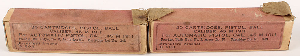 Lot of two, Frankford Arsenal, Cal. .45 M1911 Ball, 20 Rd. ammo boxes, both cart. Lot No. 348, 1pc, both FULL & SEALED, brown boxes with red label & black print, boxes are solid with light stains, bullet wear on bottom & rub marks. Grade: Excellent - Value: 20 to 40