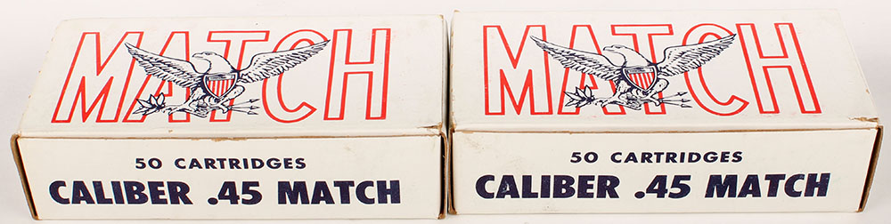Lot of two, Olin, .45 M1911 Ball Match, 79 dated, 1pc, both full, 100 Rds. Total, white boxes with blue, red, & black print, boxes are solid with light wear, ammo is excellent. Grade: Excellent - Value: 40 to 80