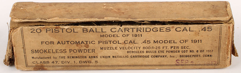 Remington, .45 ACP M1911 Ball, SEP 20, 1917 dated, 1pc, Partial 19 Rds., buff box & label with black print, box has a couple seam splits, age soiling, & rub wear, ammo is good. Grade: Very Good - Value: 10 to 30