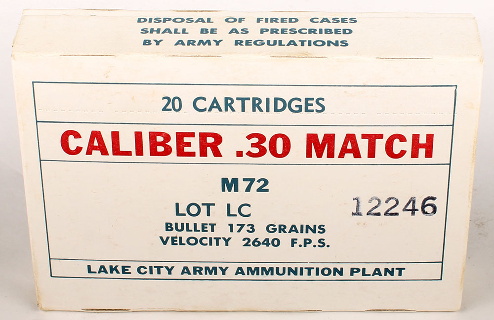 Lake City, .30 Match M72 (.30-06), Lot LC 12246, 1967 dated, 1pc, FULL & SEALED, white box with red/blue print, box is solid with minor age soiling & light rub marks. Grade: Excellent + - Value: 20 to 40