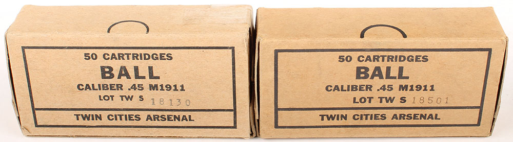 Lot of two Twin Cities, .45 ACP M1911 Ball, 50 Rd. boxes, 1pc, one Full one partial Approx 40 Rds., mix H/S & a few wrong bullet type, boxes are solid, ammo ranges from very good to good. Grade: Very Good ++ - Value: 30 to 70