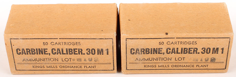 Lot of two, Kings Mills, .30 Carbine M1, 1pc, both FULL & SEALED, brown box with black print, boxes are solid with light rub wear & light wear on bottom from inside cases. Grade: Excellent ++ - Value: 40 to 80