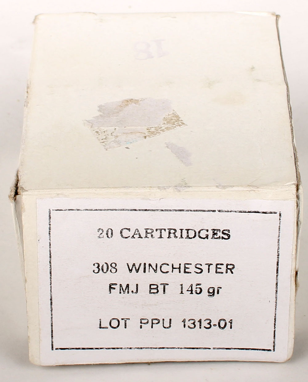 PPU (Serbian), .308 Win, FMJ BT 145 GR. Bullet, Lot PPU 1313-01, 1pc, Full, white box with black print, box has light stains, rub marks, & stock mark on side, ammo is excellent. Grade: Excellent + - Value: 10 to 20