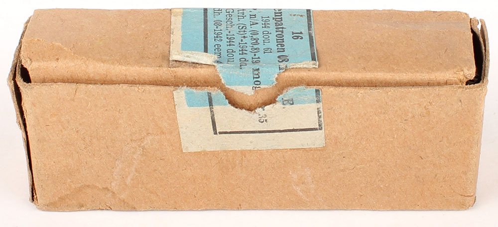 German, 9x19mm Pistolpatronen 08.m.E., 16 count box, 1944 dated box, ammo is mix MFG. dates, 1pc, Full,. box, brown box with buff/blue label & black print, box is solid with light rub wear, ammo is very good, likely has corrosive primers. excellent+ - Value: 10 to 30