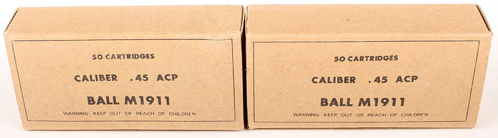 Lot of two, HHC LTD. Taipei Taiwan, .45 ACP M1911 Ball, 50 count boxes, brass case, both boxes ammo is dated 1982, 1pc, Full, 100 Rds. total, brown boxes with black print, boxes are solid with light wear, ammo ranges from excellent to very good. Grade: Excellent ++ - Value: 40 to 80