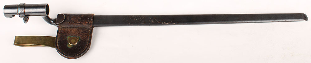 US, M1873 Trapdoor socket bayonet, with sheath & leather frog with brass clip hanger, bayonet is blued, has sspots of patina & light rust, top of blade marked ''US''. Brass hanger marked ''US''. Grade: Excellent - Value: 100 to 250