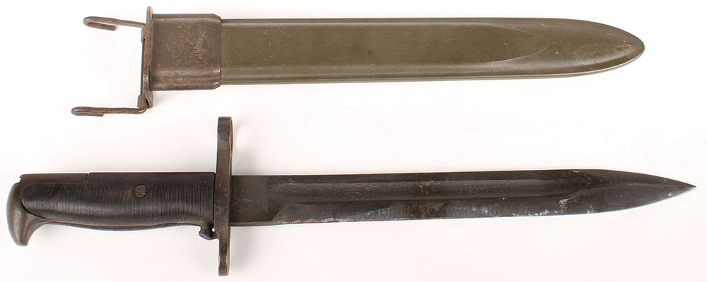 US, Union Fork & Hoe Co., M1 Bayonet with sheath, black plastic grips, parkerized steel, left side of blade marked ''U.F.H.'', ''U.S.'', & a flaming bomb, sheath marked ''U.S.'' in a flaming bomb. Grade: Excellent - Value: 80 to 200