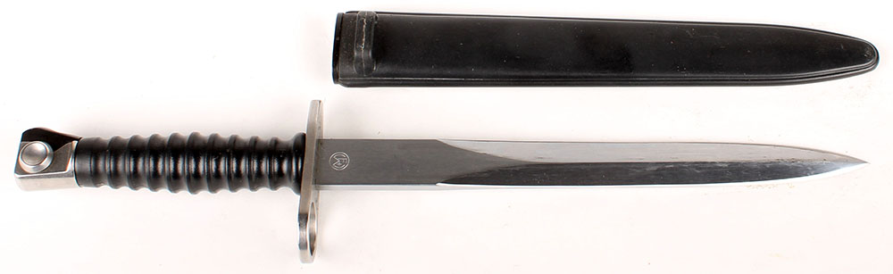 Swiss, Wenger & Co., M1957 Bayonet with plastic sheath, black plastic grip, stainless steel metal, left side of blade marked ''W+F'' in circle, right side marked ''W'' over ''533632''. Grade: Excellent + - Value: 40 to 80