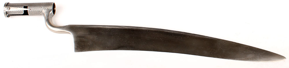 IMI, Reproduction Nepalese Chipri socket bayonet, AKA a Kukri Bayonet, they were made in a variety of lengths and styles. It was designed to fit flintlock muskets such as the Brown Bess, cap lock conversions like the P-1842 Musket, and most muskets with .900'' or slightly smaller muzzle diameter, for the wide variety of rifles Nepal would use over its history. Has Nepalese script on top of socket. Grade: Excellent - Value: 50 to 150