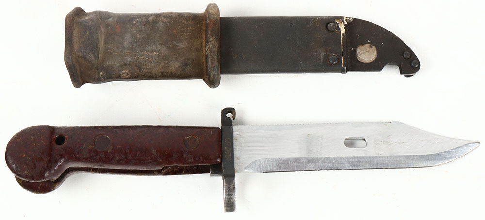 Romania, AKM type 1 (M1959) bayonet, with sheath & hanger, Bakelite handle, bare steel blade, left side of guard is electro penciled ''CP 2651''. Grade: Very Good ++ - Value: 16 to 60