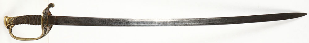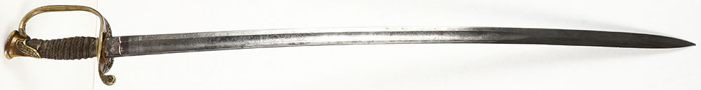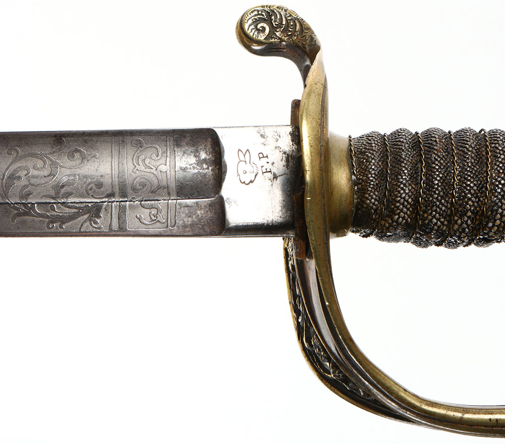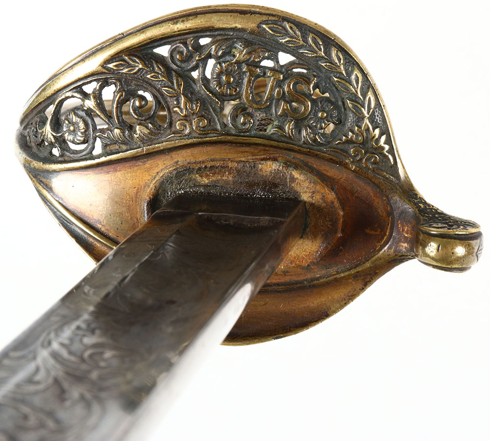 US, Friedrich Pather, M1850 Foot Officer's Sword, brass wire wrapped leather grip, grips has rub/use wear & aging patina. Brass handguard with a decorative floral & ''US'' design, brass has dark patina in protected areas, & overall has a aged patina. The blade has a etched decorative floral design with images of crossed halberds & flags, as well as ''US''. Left side of blade is marked with a Hare's head over ''F.P.''. The blade has beginnings of dark patina forming. Blade has a kink & bend to the left at the mid point. These swords would be issued to all officers ranked Major or below between 1851 to 1865. This was one of the most seen officers swords during the Civil war. Grade: Very Good ++ - Value: 200 to 400