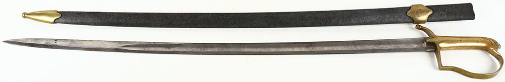 US, W.H. Horstmann & Sons, Naval Marine Officers sword, 1815-1820, with matching shagreen scabbard. Brass handle with spotty patina. Both sides of the blade is etched with intricate floral designs, American eagles, ''US'', & other American imagery, the right side of the blade is etched ''W.H.'', ''HORSTMANN'', ''& SONS'', ''PHILADELPHIA''. The spine of the blade is etched ''IRON PROOF''. The blade has a light speckling of dark patina. The scabbard is missing the throat piece. The leather has rub wear & small nicks, the brass furniture has light spotty patina. Grade: Excellent - Value: 150 to 400