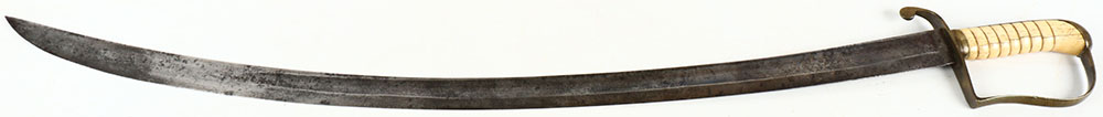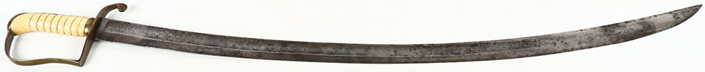 US Imported, Cavalry saber Circa 1820's-30's, patterned off a British P1796 light Cav Saber, no makers marking but closely resembles swords made by JS & Co., a British sword maker around that time. White/yellow grooved handle, appears to be tusk or bone, has small chip on right side. Brass guard with patina. Blade has spotty dark patina. The left side of blade is etched with a floral design, the right side is etched with a crossed American shield, cannon, & spear design. No other visible markings. Grade: Excellent - Value: 100 to 300