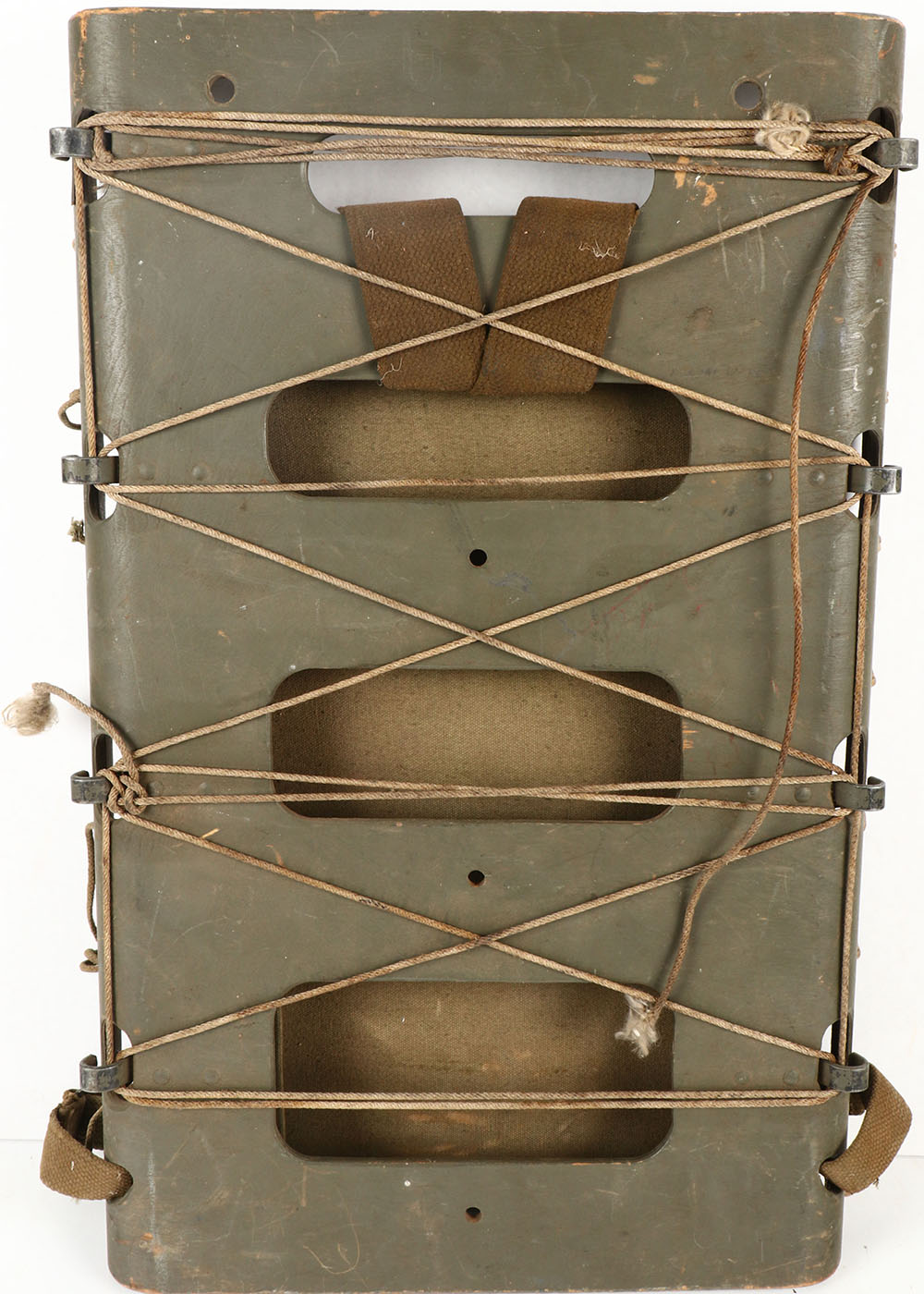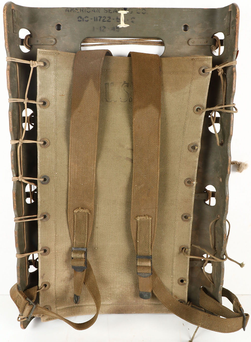 US, American Seating Co, Wood pack board frame, dated 1-12 -1945. has canvas straps, & backing. Canvas has sweat stains. wood & canvas are stamped ''US''. Grade: Very Good + - Value: 50 to 150