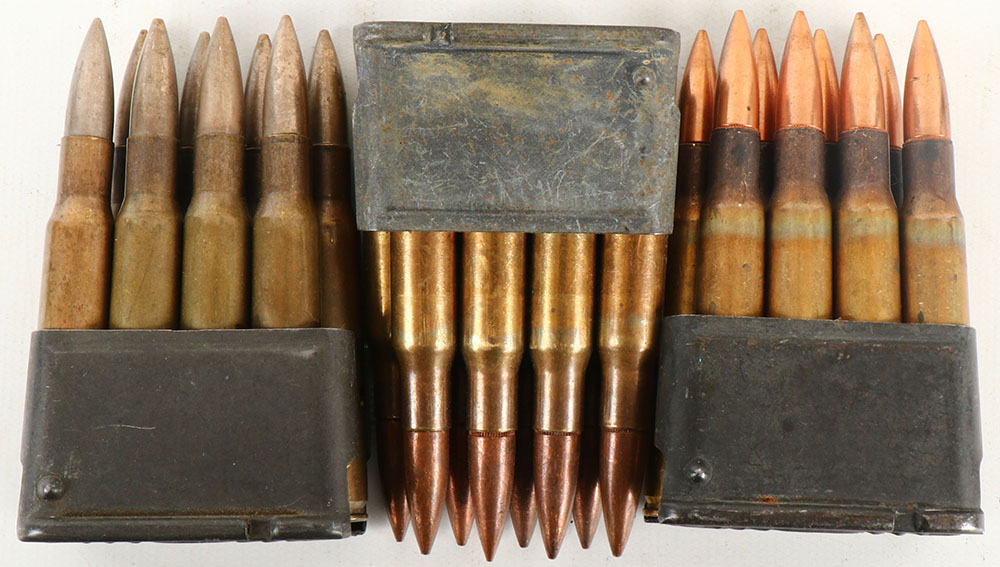 Lot of three loaded M1 Garand en-bloc clips, 24 total Rds. of .30-06, one clip (8 Rds.) are dummies with holes in side of case & dented primers, the other two clips (16 Rds.) is 50's surplus M2 ball. Grade: Very Good ++ - Value: 10 to 30