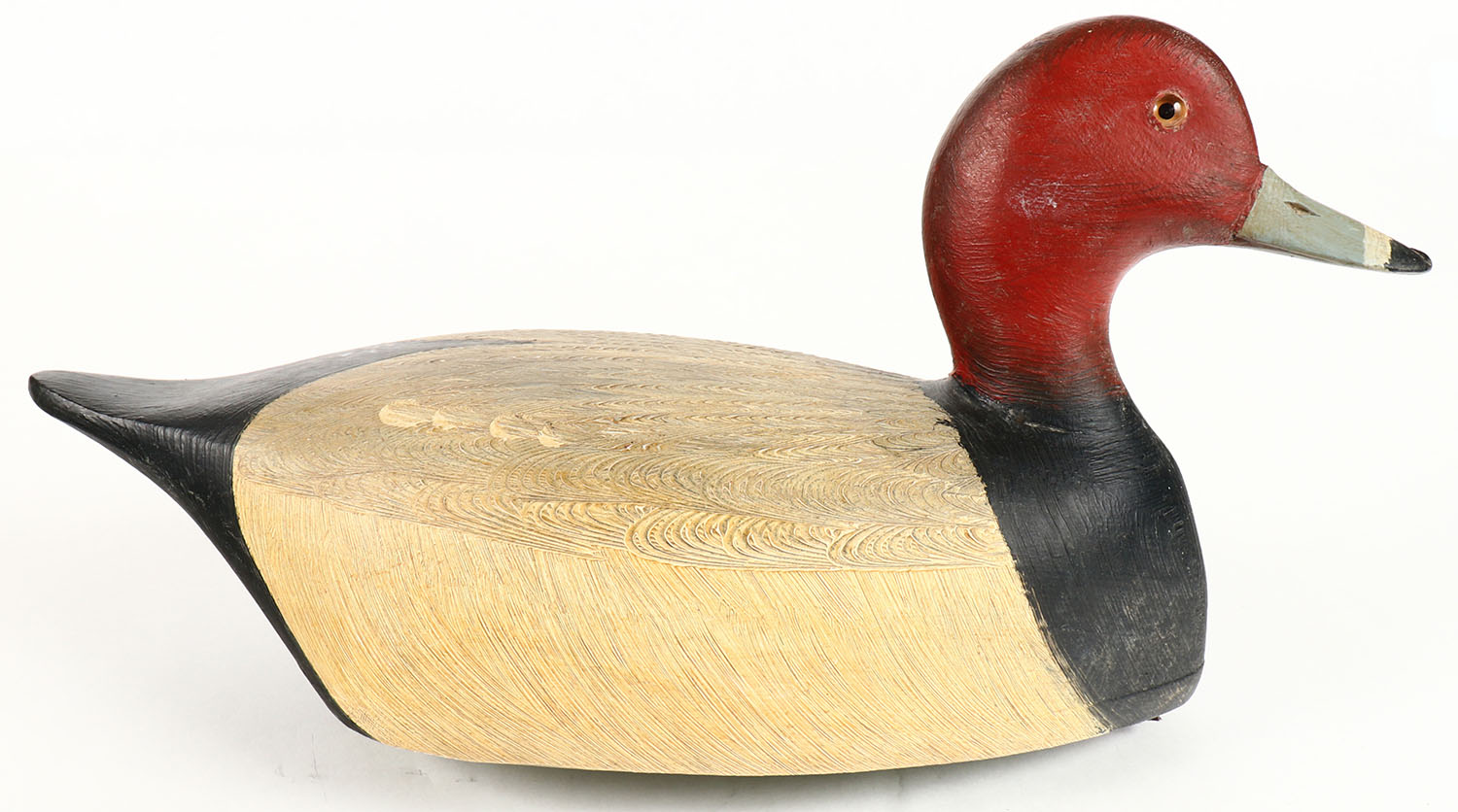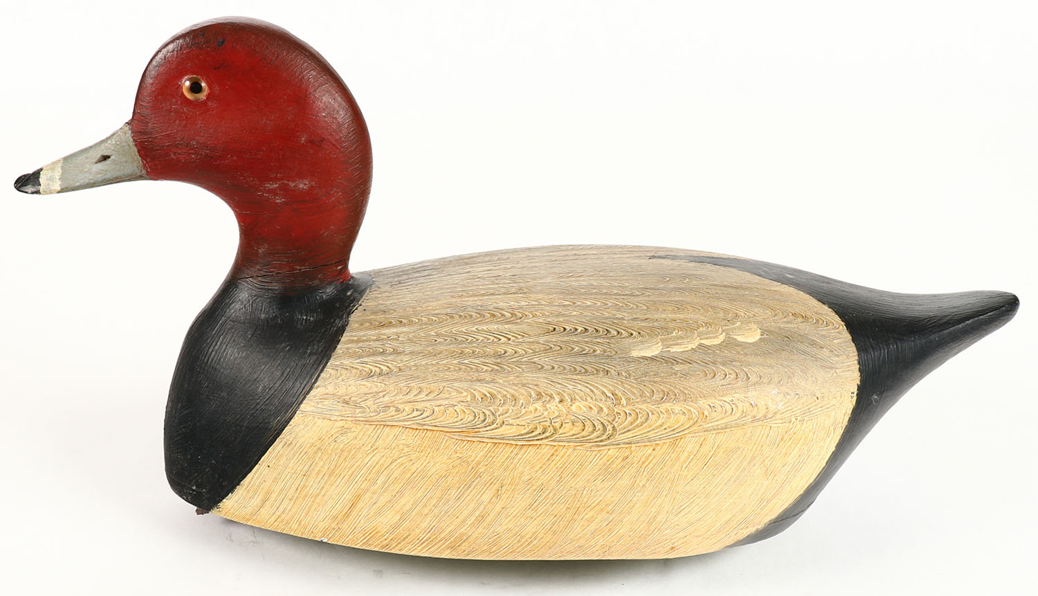 Redhead Drake by Jim Slack, Pekin, IL, glass eyes, hollow wood, excellent original comb paint, the Hen pair is in the next lot, 13 1/2'' OAL. Grade: Excellent ++ - Value: 50 to 100