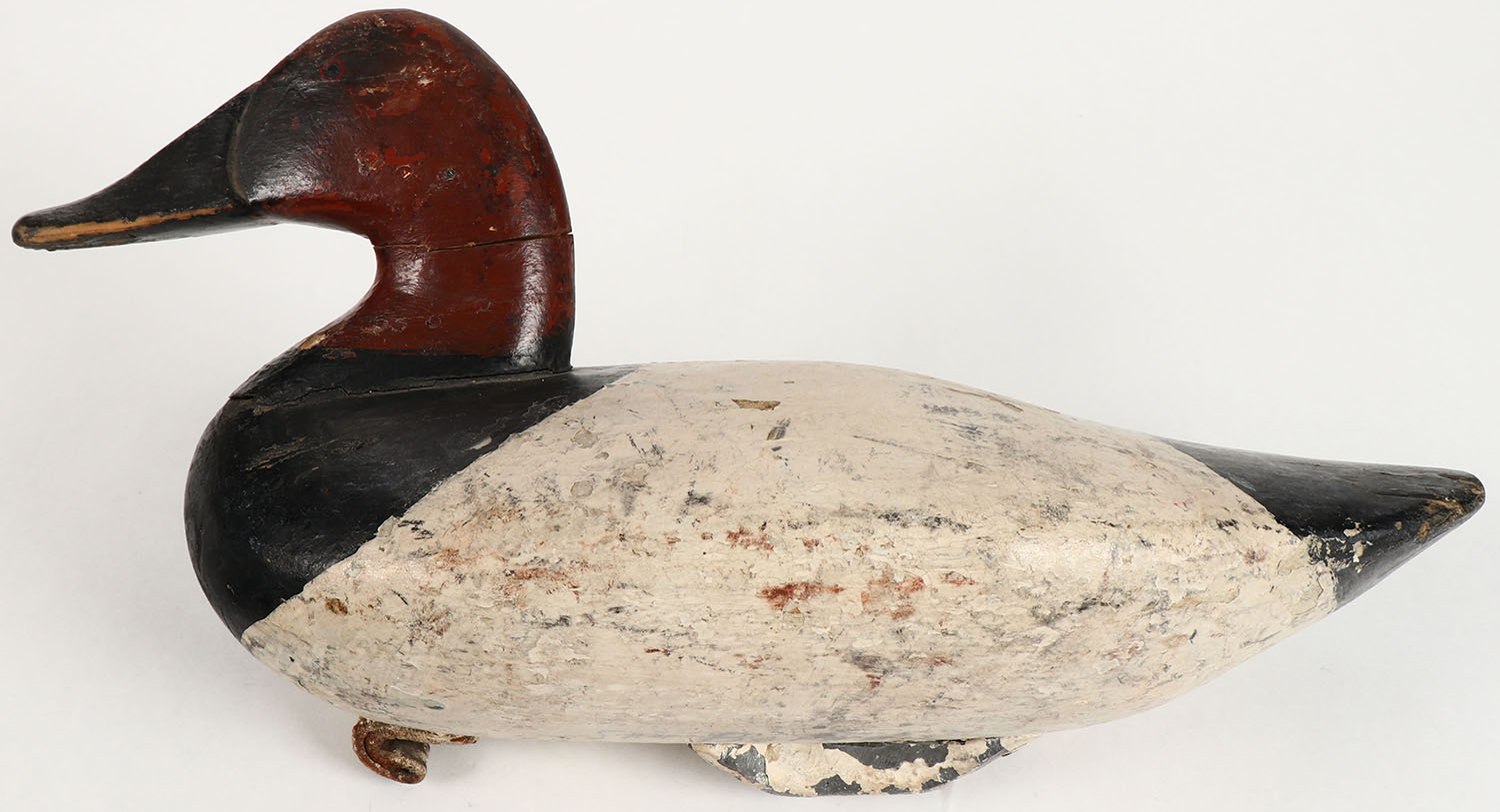 Early Canvasback Drake by Charles Barnes, Chesapeake Bay MD, circa 1900's, PE, old working repaint, leather line tie, show high hairline neck crack. 14 1/2'' OAL. Grade: Very Good - Value: 50 to 100