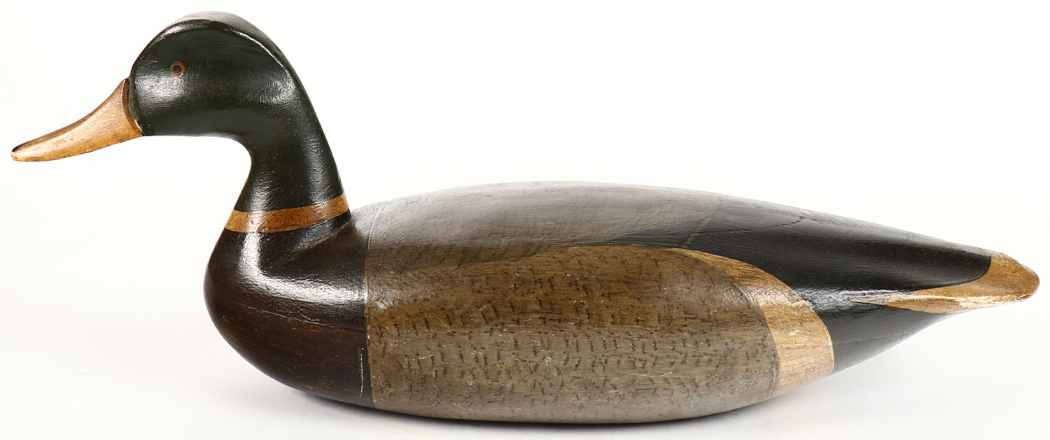 Mallard Drake by Chip Alsorp Pt. Pleasant MD, PE, hollow wood, wondaful original detailed comb paint, structurally excellent, leather line tie, 18 1/2'' OAL. Grade: Excellent + - Value: 200 to 500