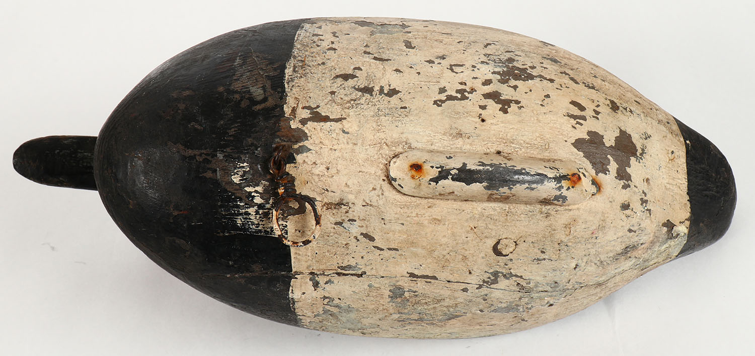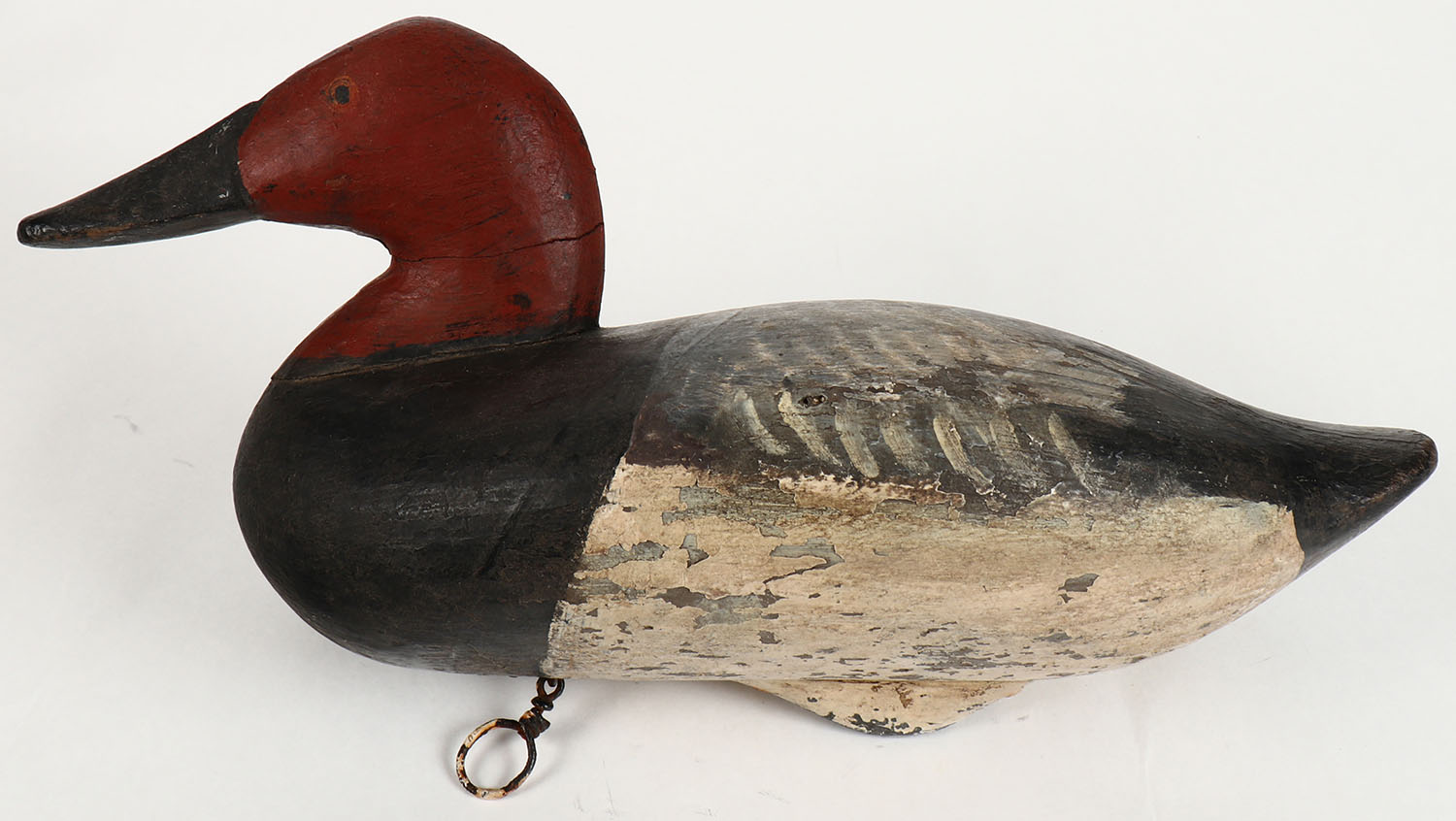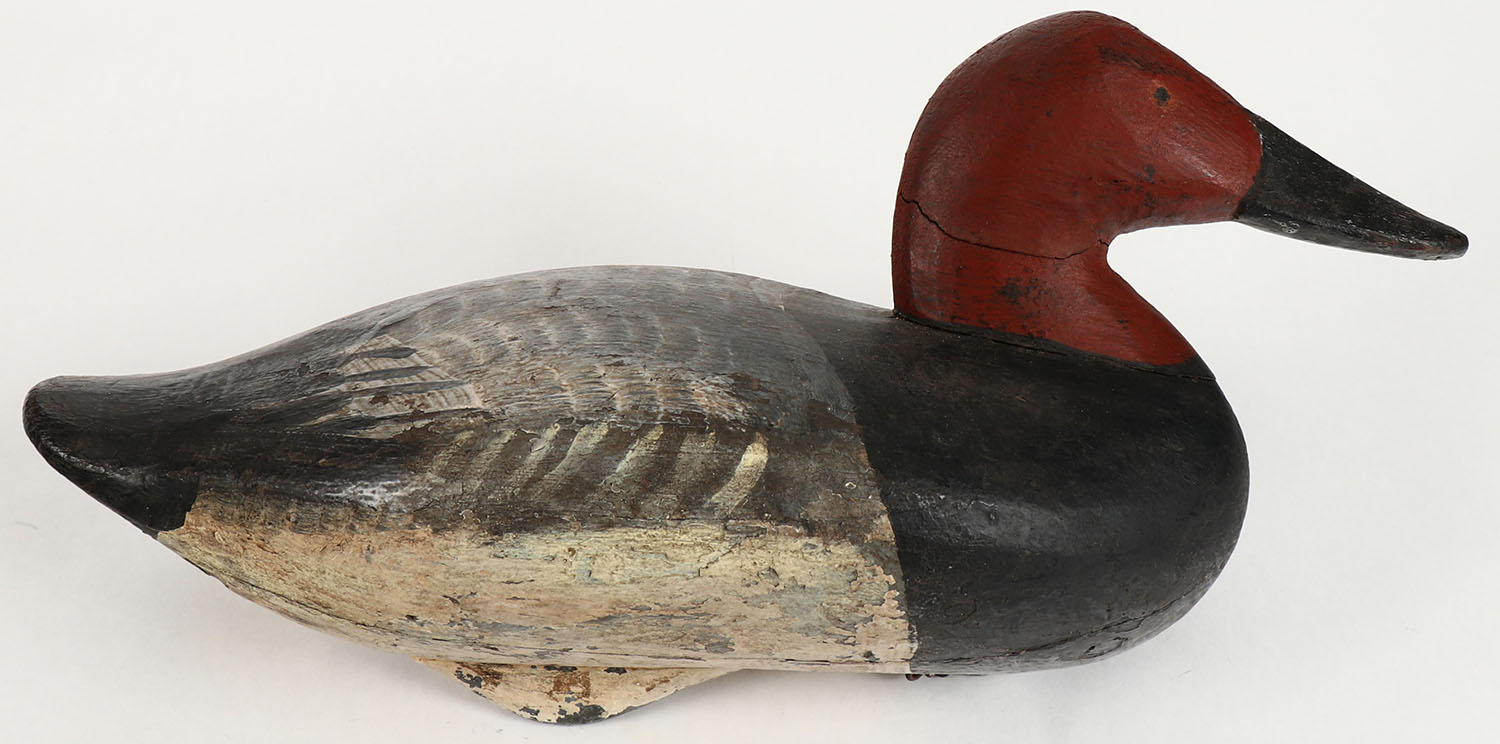 Canvasback Drake by unknown maker, PE, old working repaint, high hairline crack in neck, 15'' OAL. Grade: Very Good - Value: 30 to 80