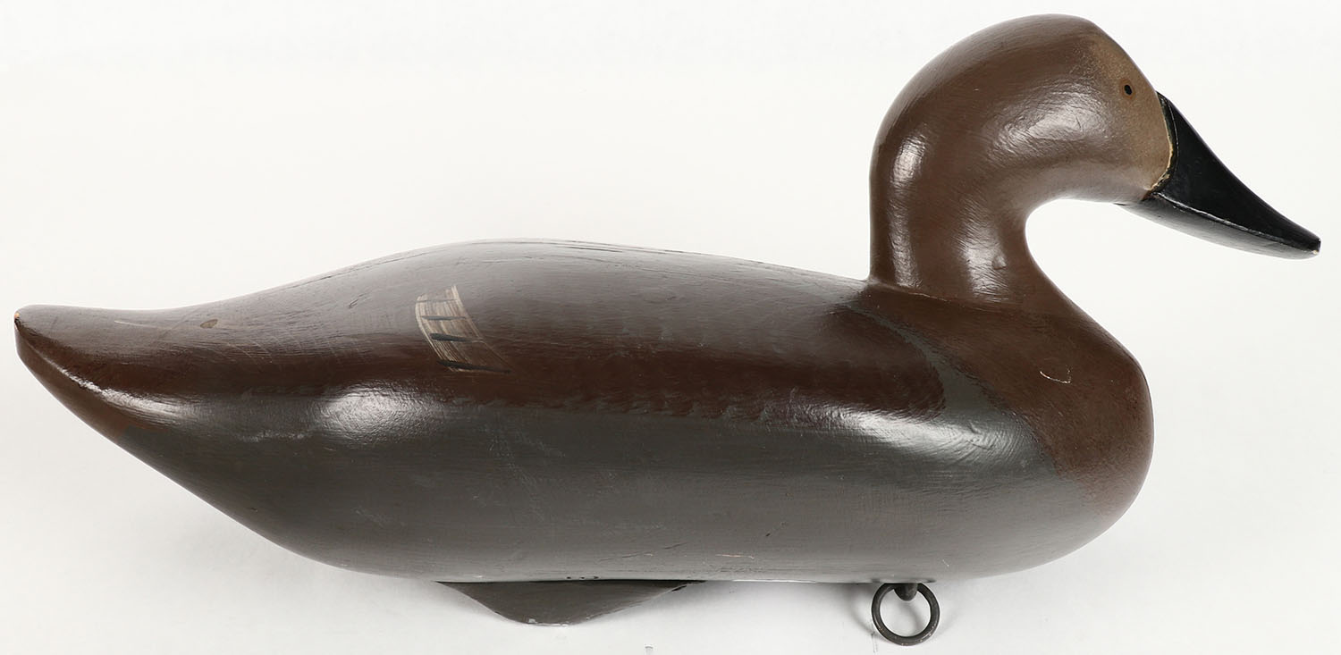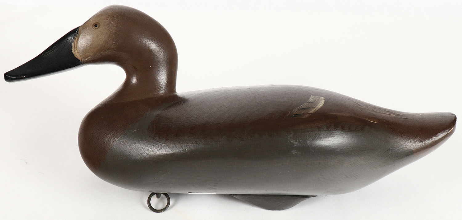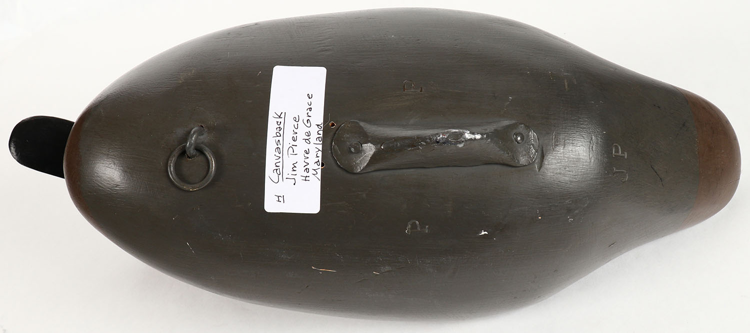 Canvasback Hen by Jim Pierce, Havre De Grace MD, painted eyes, solid wood, structurally excellent, stamped ''JP'' & ''P'' twice on bottom, 16'' OAL. Grade: Excellent + - Value: 50 to 100