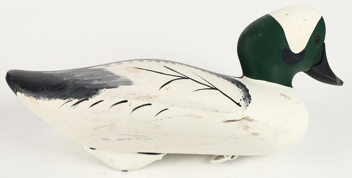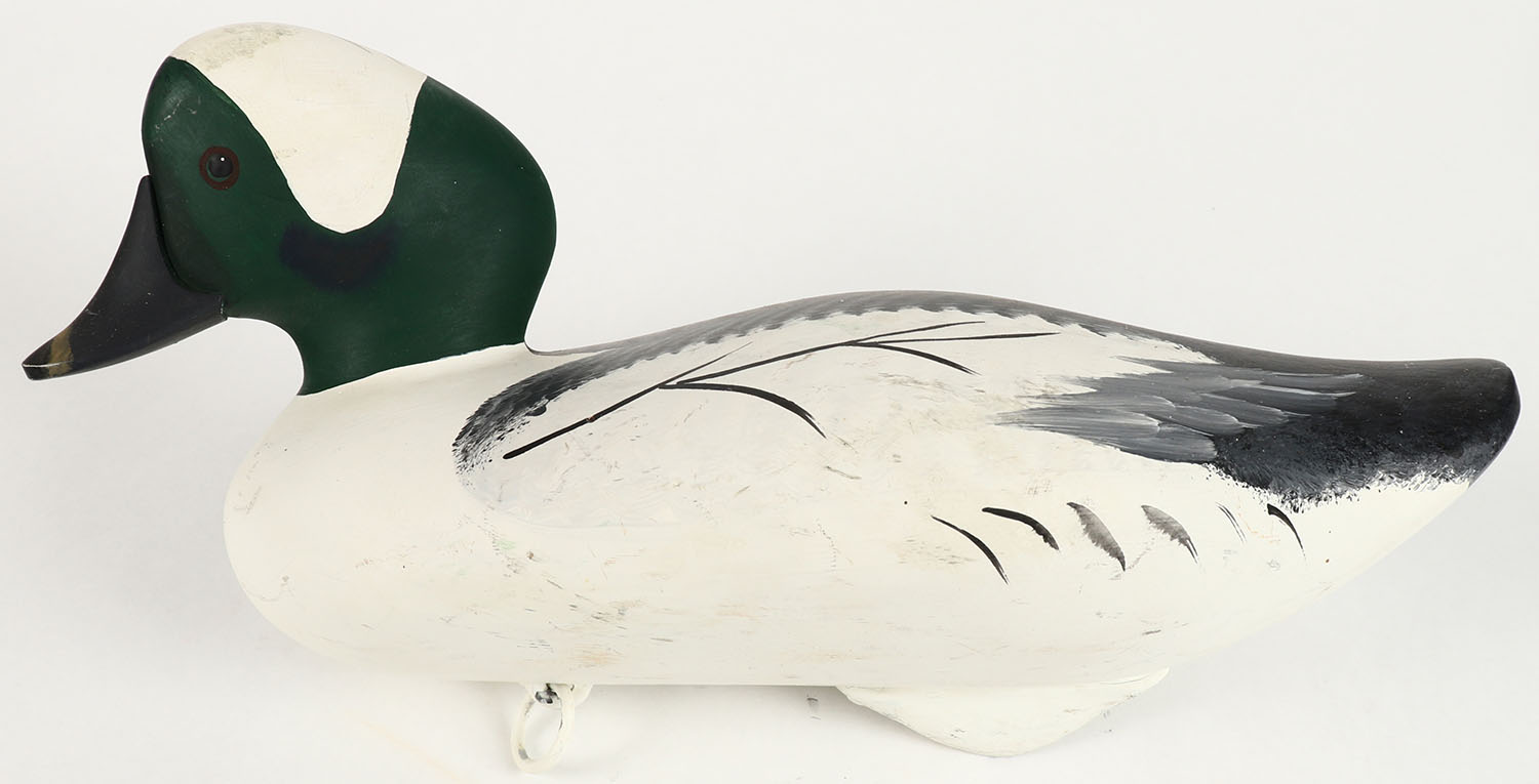 Bufflehead Drake by Jim Pierce, Havre De Grace MD, painted eyes, solid wood, structurally excellent, signed Jim Pierce & stamped ''JP'' on bottom, 13'' OAL. Grade: Excellent + - Value: 50 to 100
