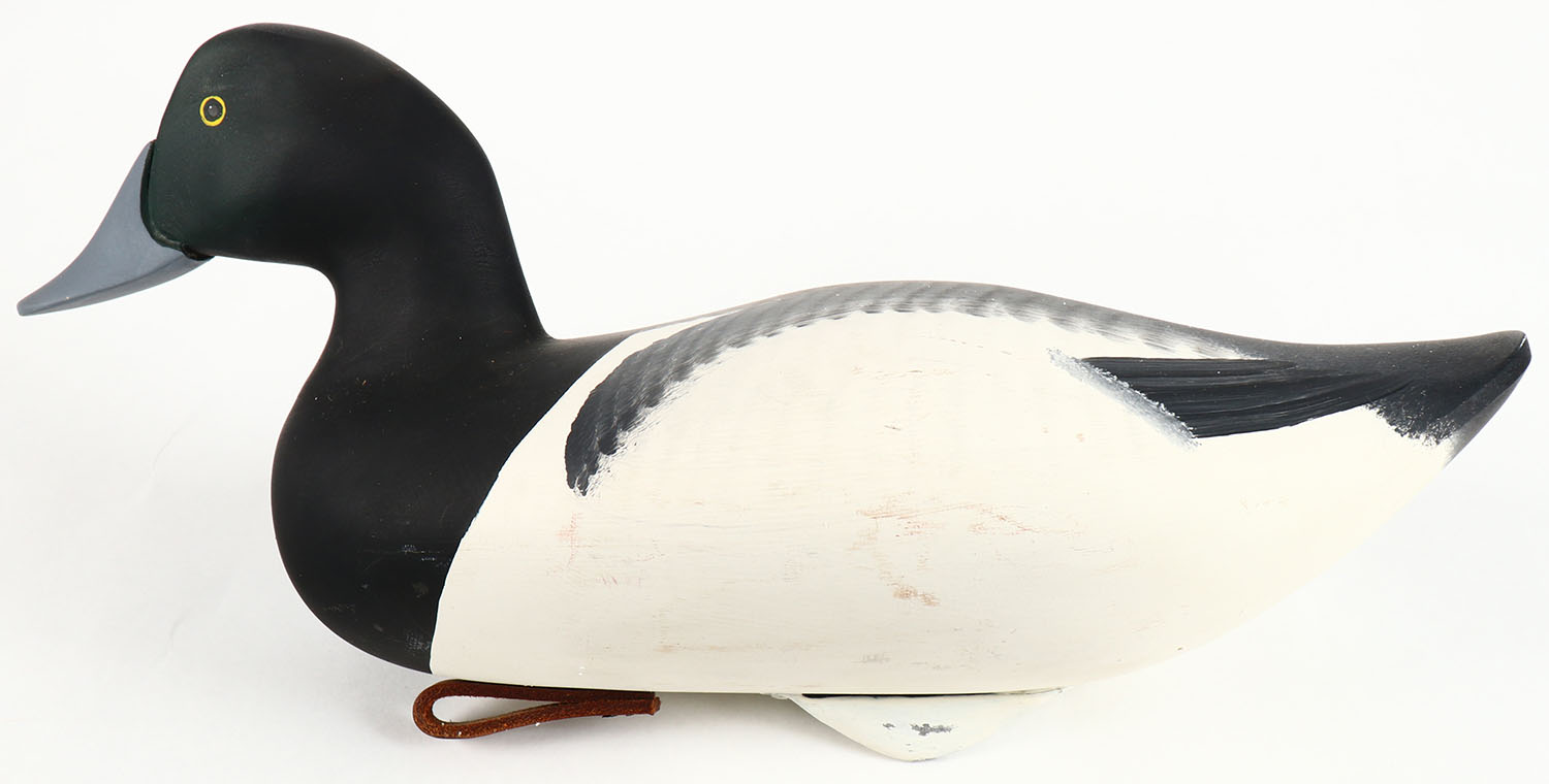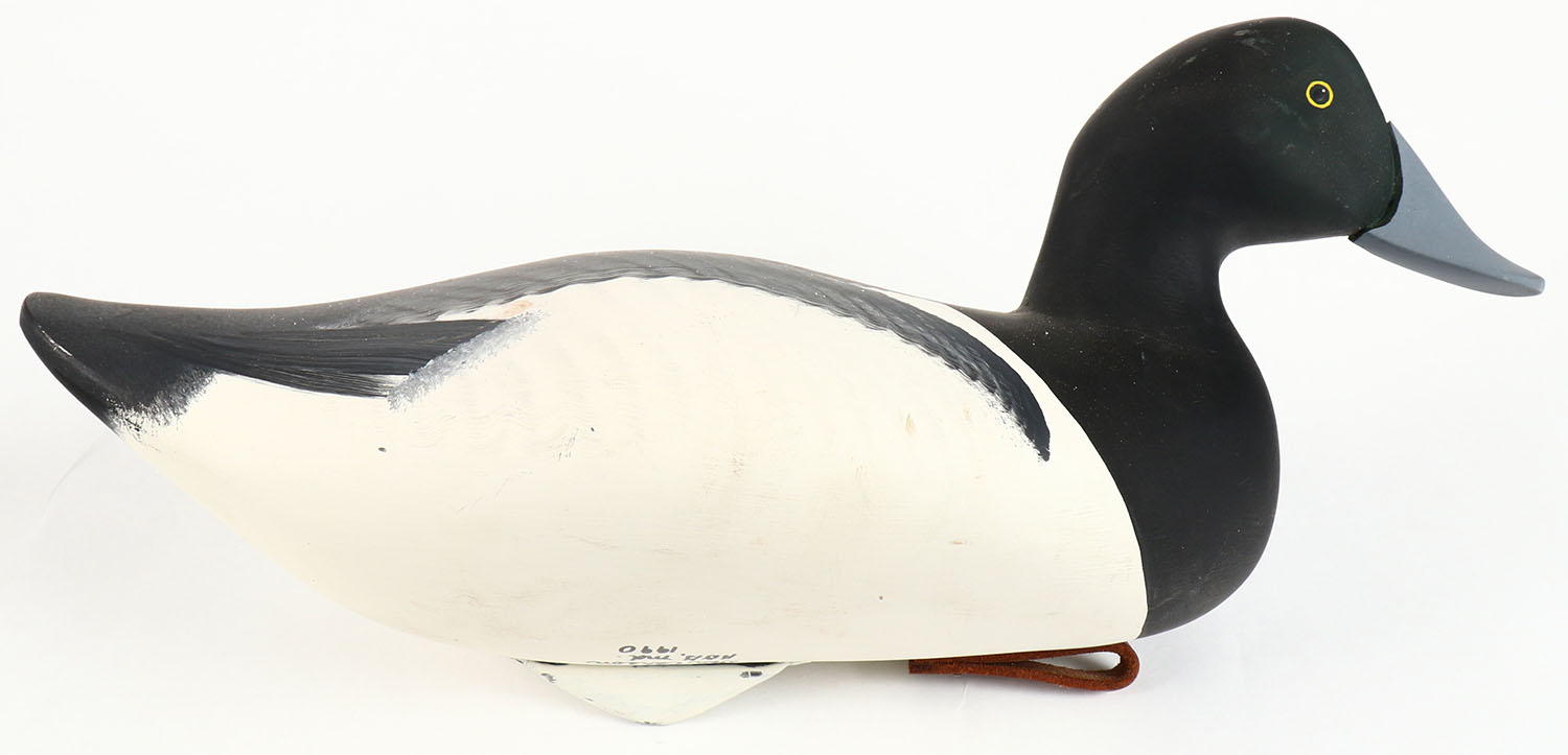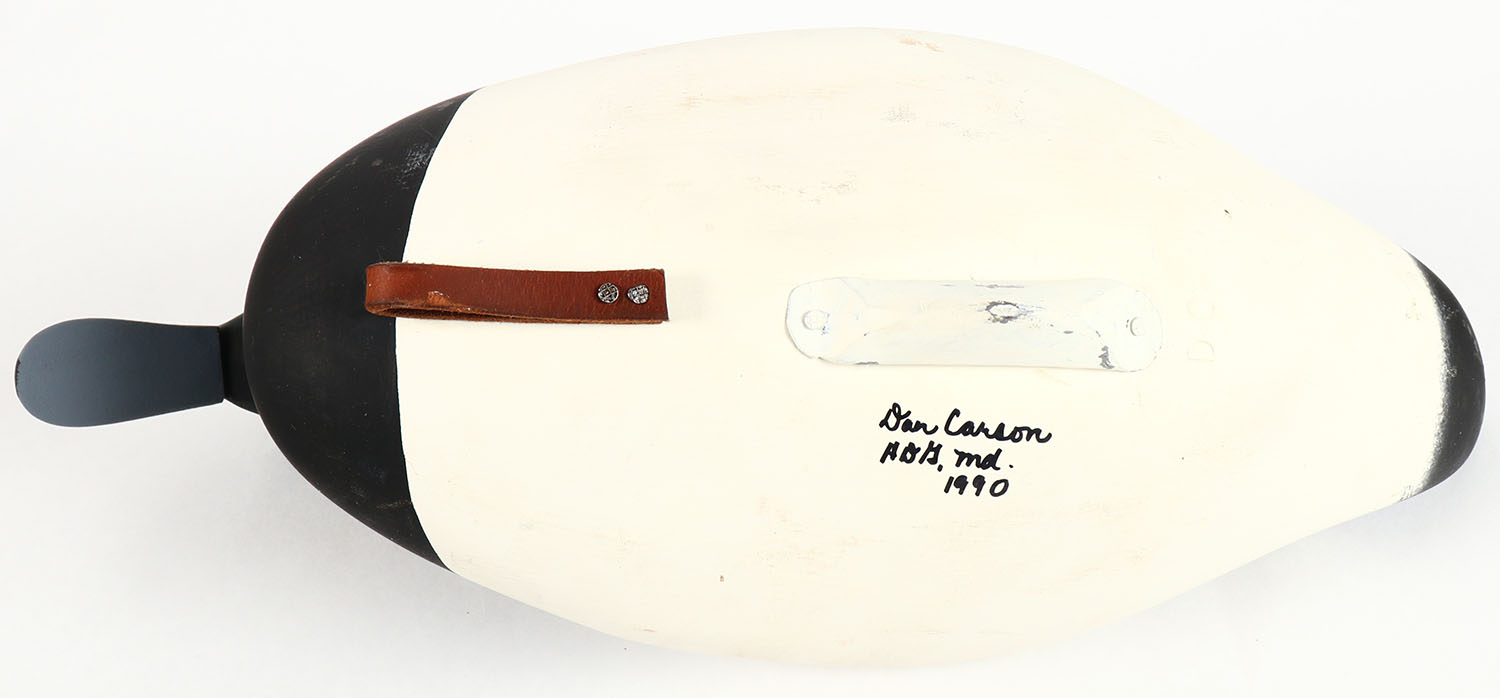Bluebill Drake by Dan Carson, Havre De Grace, MD, PE, solid wood, original paint, structurally excellent, signed on bottom, 15'' OAL. Grade: Excellent ++ - Value: 40 to 80
