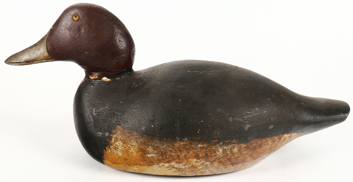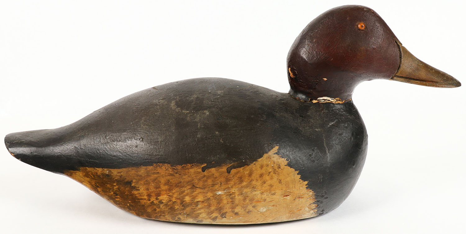 Redhead Drake by unknown factory, GE, hollow wood, old repaint, 15'' OAL. Grade: Very Good ++ - Value: 30 to 60