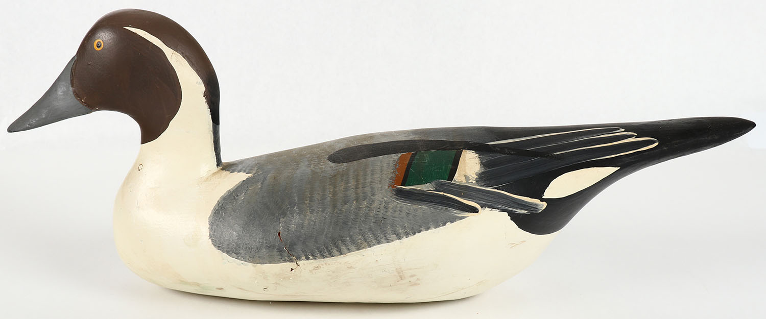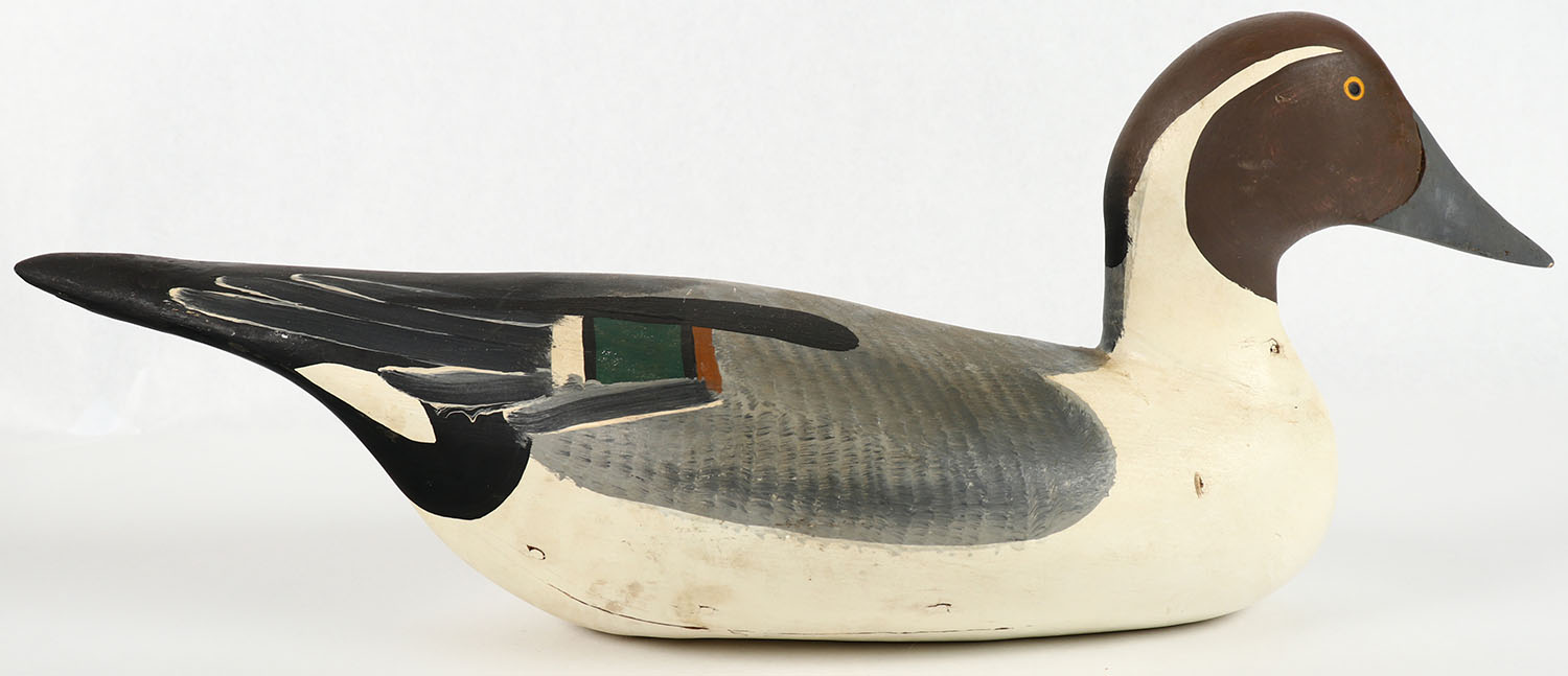 Pintail Drake by Clarence ''Titbird'' Bauer, Haver de Grace MD, (1925-2006), PE, solid wood, nice original paint, structurally excellent, Clarence worked for Jim Curriers Decoy shop, Madison Mitchell & Capt. Bob's Decoy Shop over the years, 17'' OAL, Grade: Excellent + - Value: 40 to 80