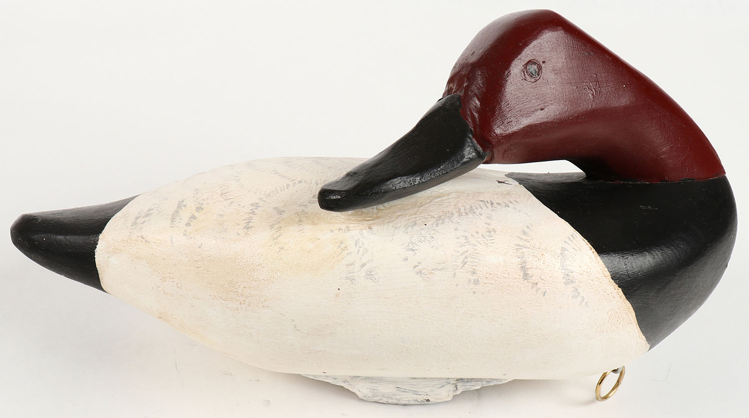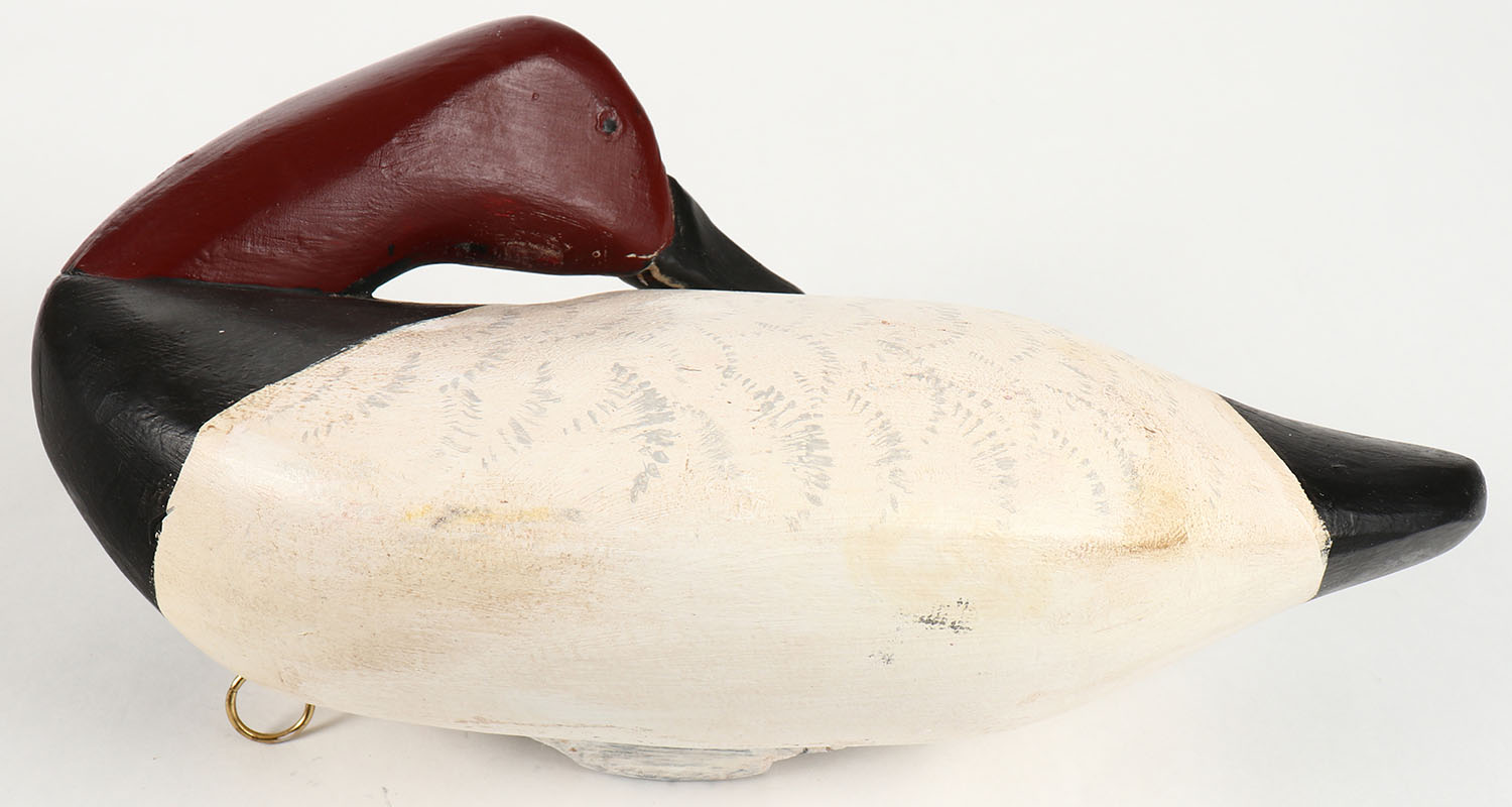 Preening Canvasback Drake by unknown maker from MD, PE, solid wood, original paint, structurally excellent, 13'' OAL. Grade: Excellent - Value: 20 to 40