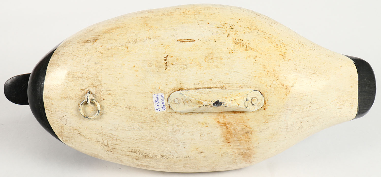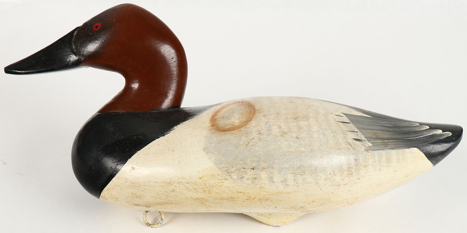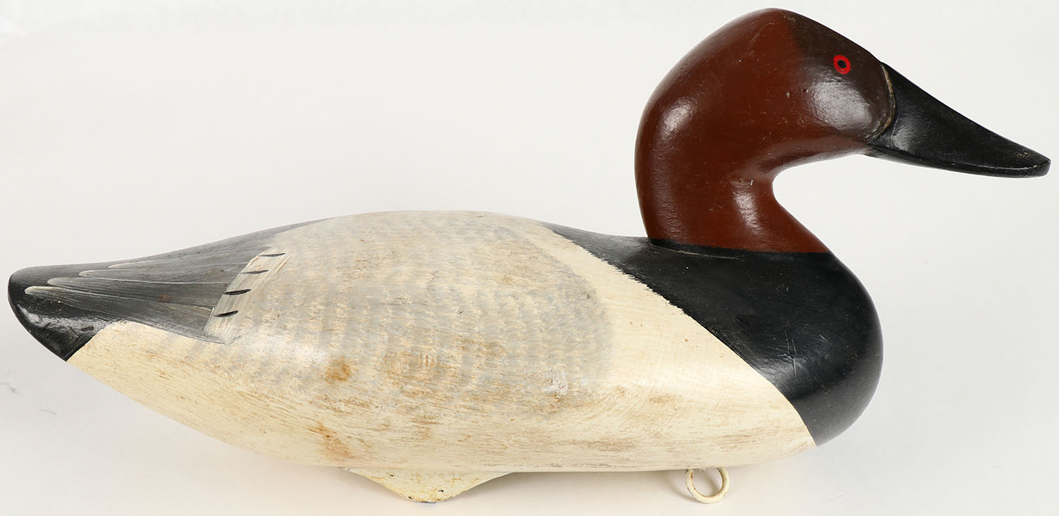 Canvasback Drake by Clarence ''Titbird'' Bauer, Haver de Grace MD, (1925-2006), PE, solid wood, nice original paint, structurally excellent, Clarence worked for Jim Curriers Decoy shop, Madison Mitchell & Capt. Bob's Decoy Shop over the years, 16'' OAL, Grade: Excellent + - Value: 40 to 80