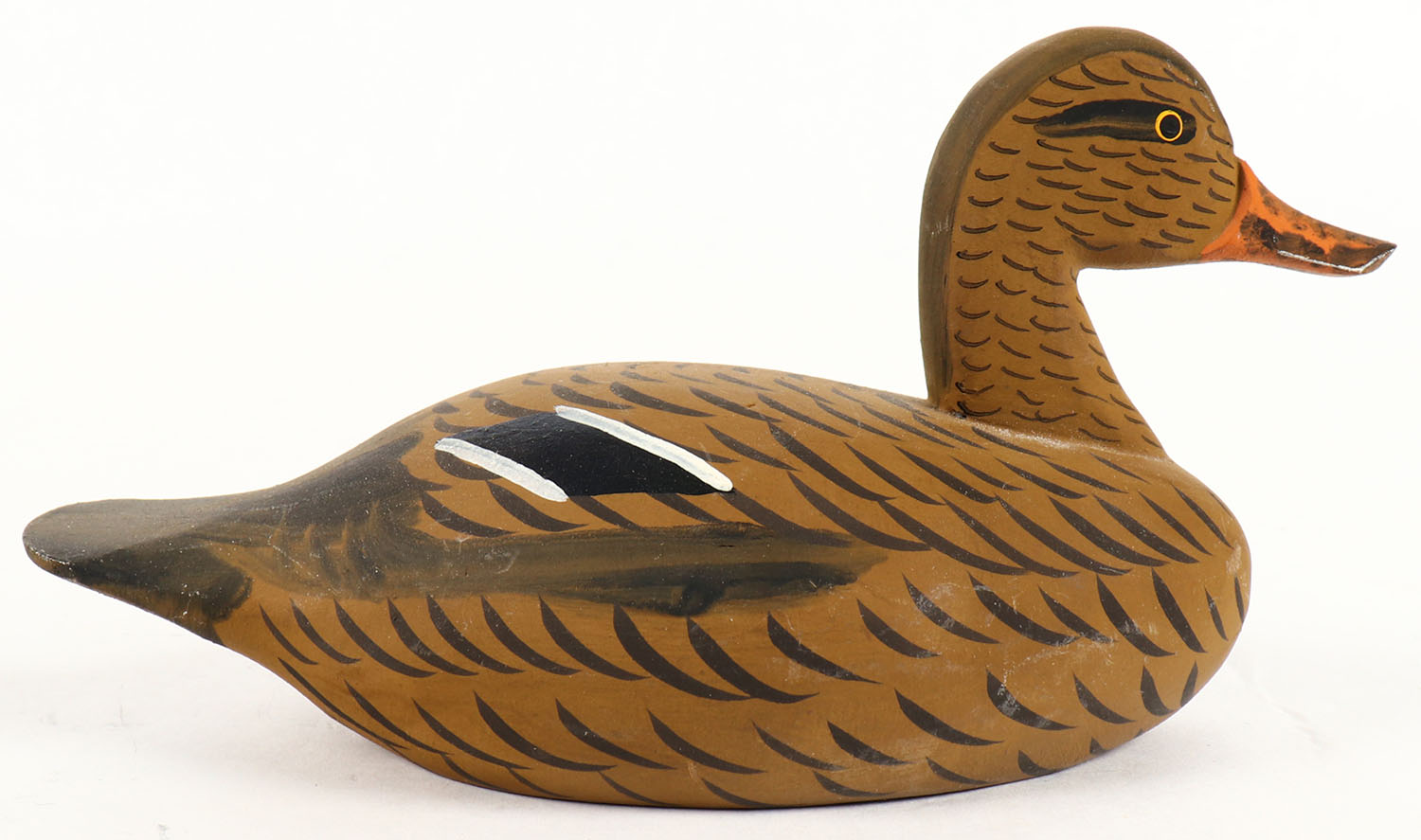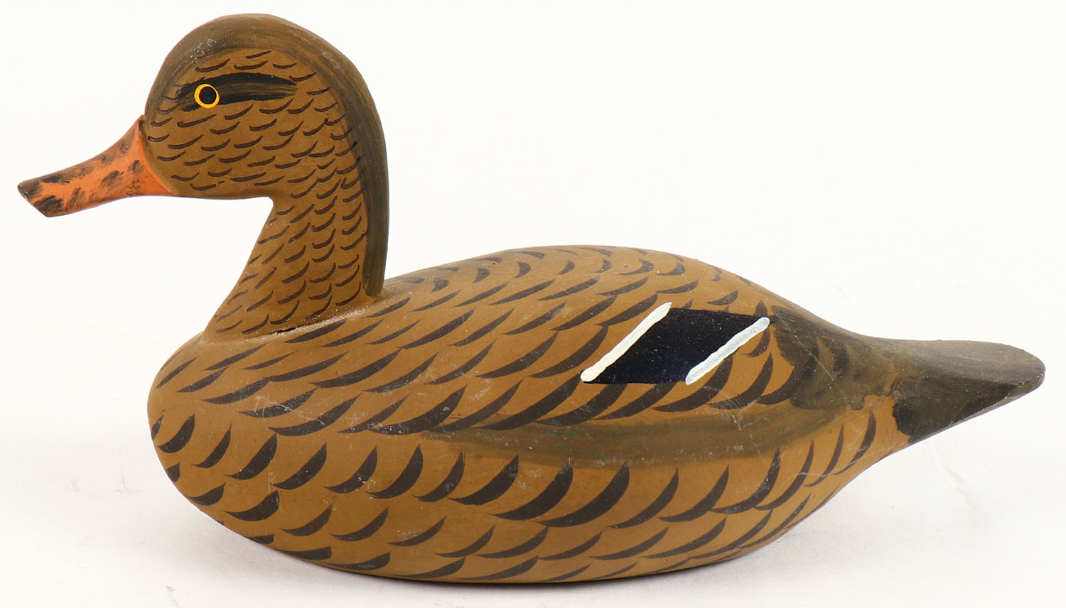 Miniature Mallard Hen by Jessie Urie, Rock Hall, MD, GE, solid wood, original paint, 6 1/2'' OAL. Grade: Excellent ++ - Value: 40 to 80