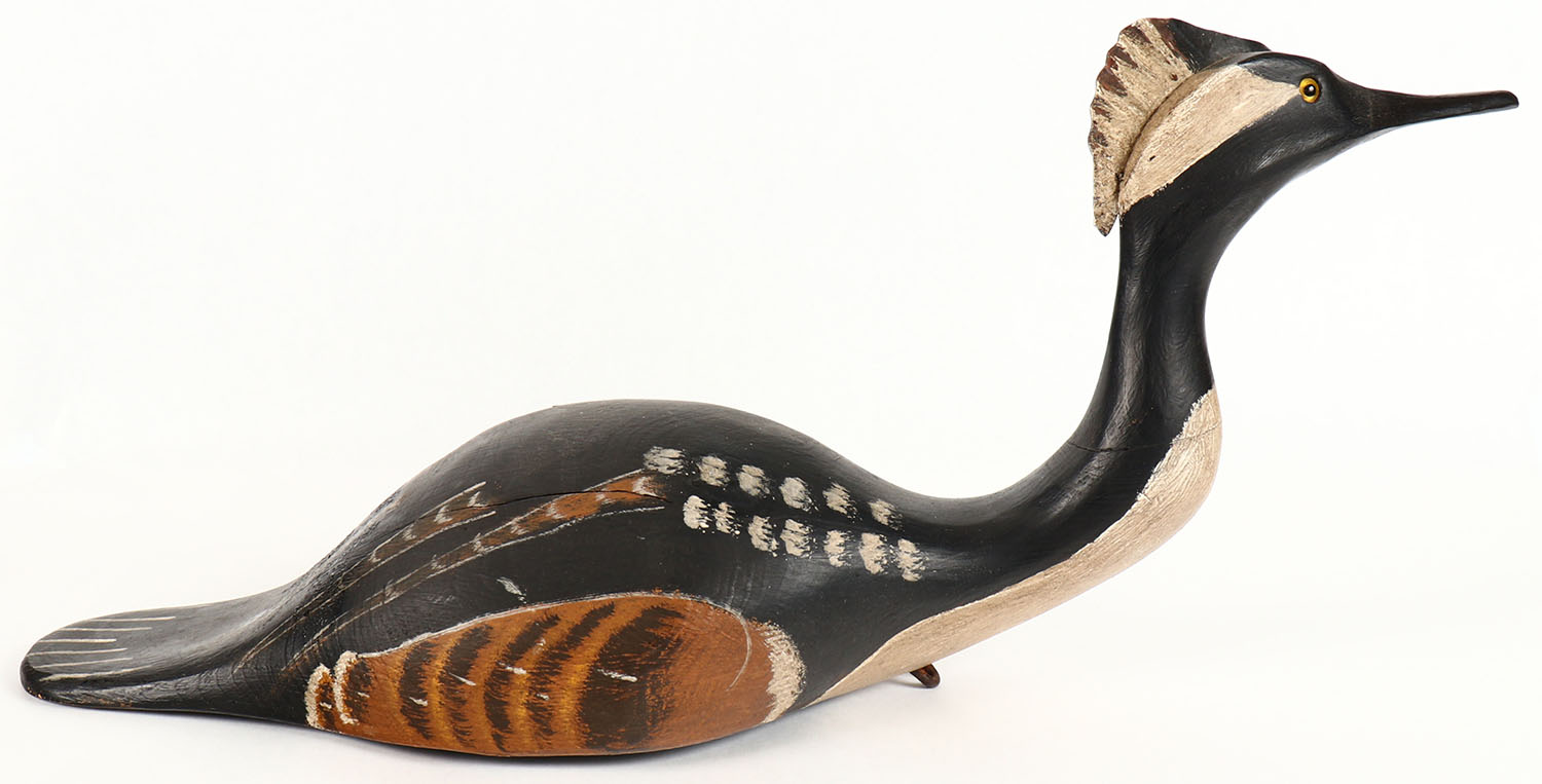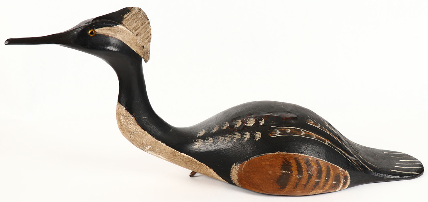 Hooded Merganser by unknown maker, GE, solid wood, has early copper patch on back with nails that has original paint over the top, has metal hood on top of head, 22'' OAL, Grade: Excellent - Value: 10 to 100