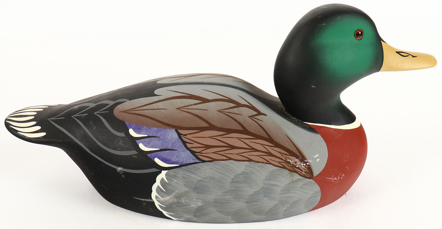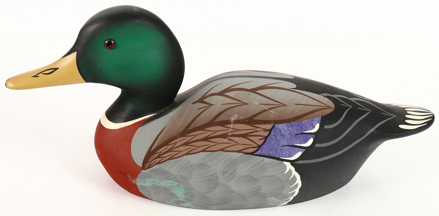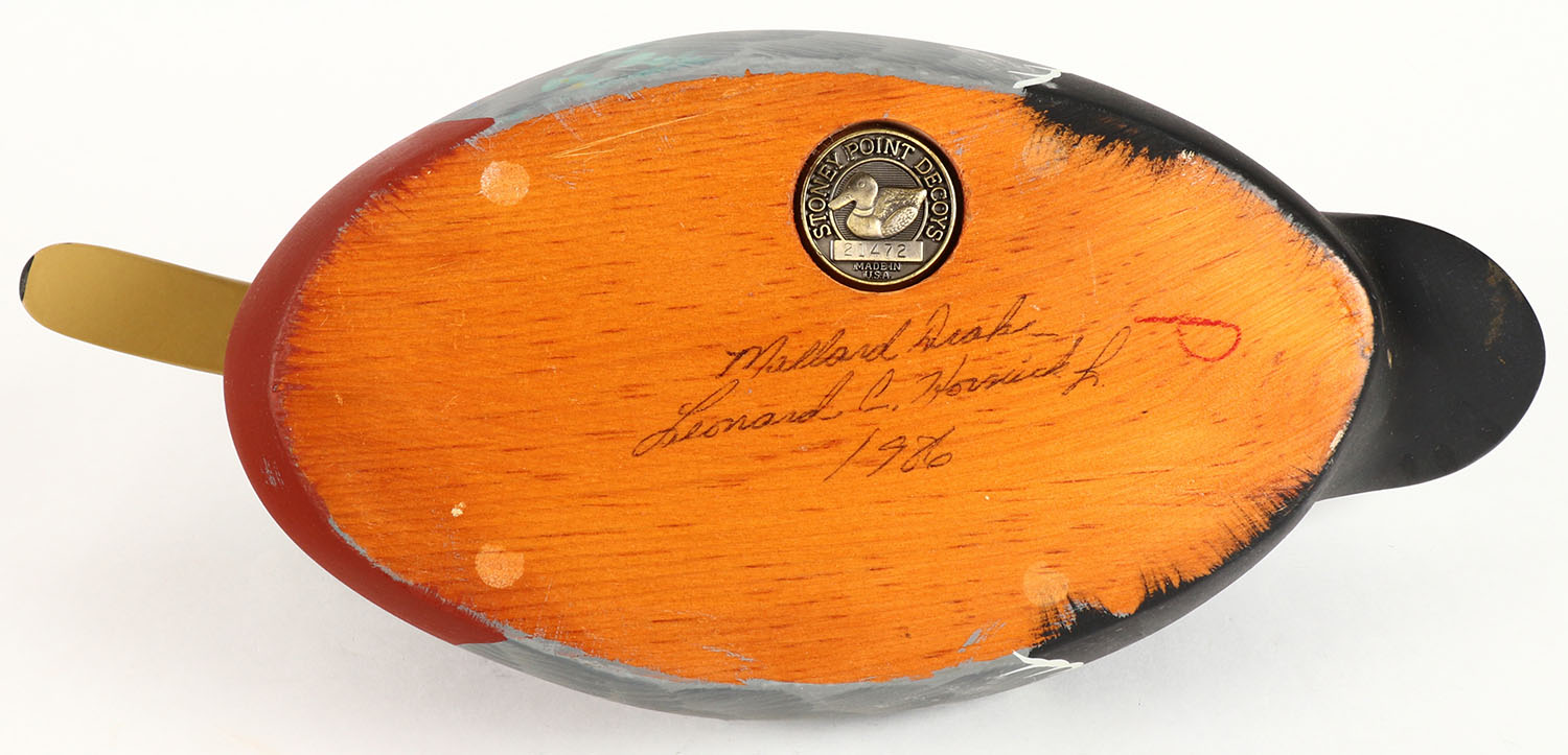 Mallard Drake by Lenard C. Hornick, Stoney Point Decoys, Oak Hal, VA, glass eyes, solid wood, original paint, structurally excellent, stamped & signed on bottom. Grade: Excellent + - Value: 20 to 40