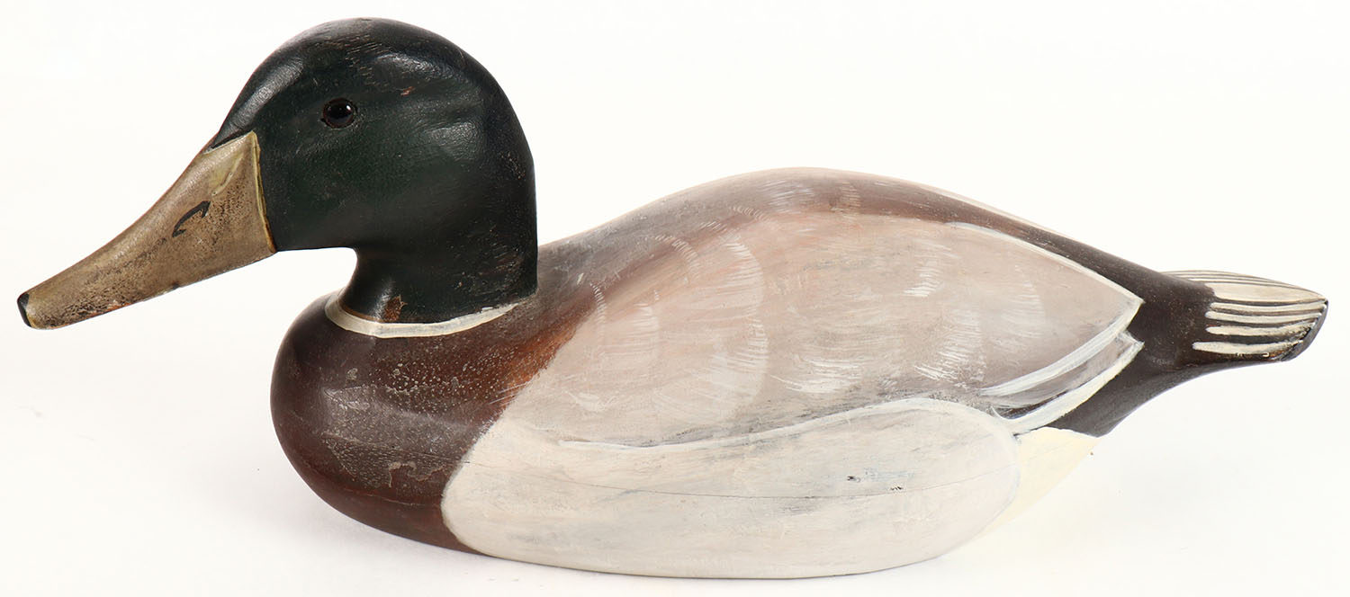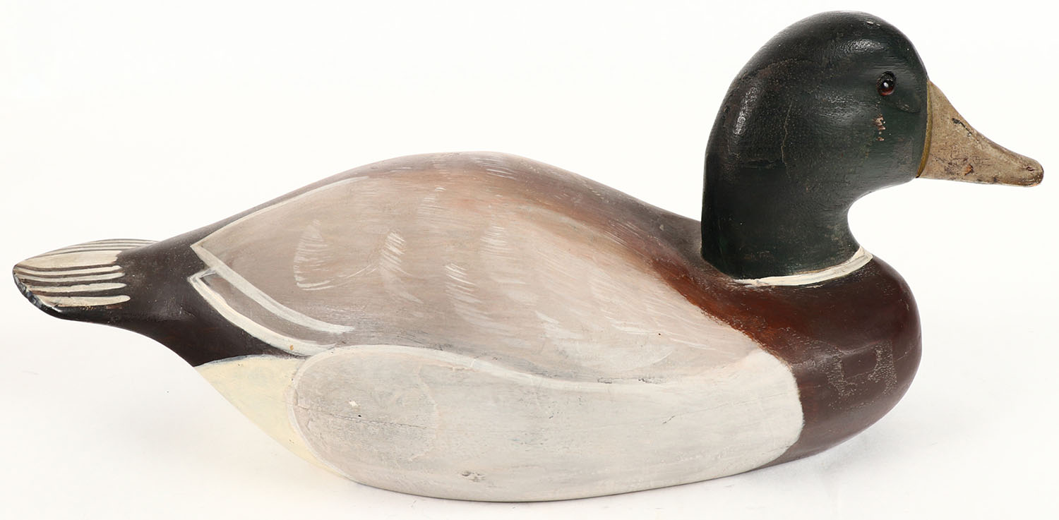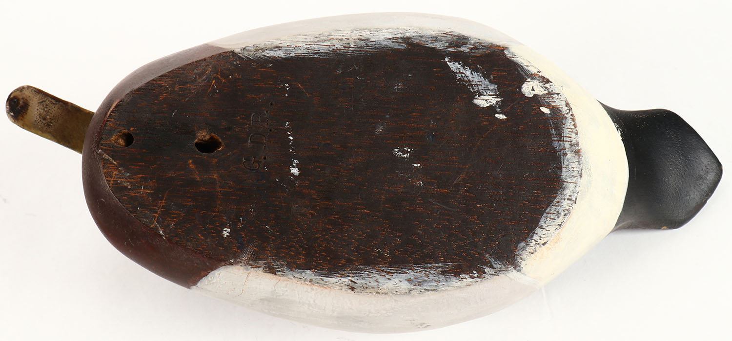 Mallard Drake by G.D.R., GE, hollow wood, original paint is nice, branded on bottom, 14'' OAL. Grade: Excellent + - Value: 10 to 30