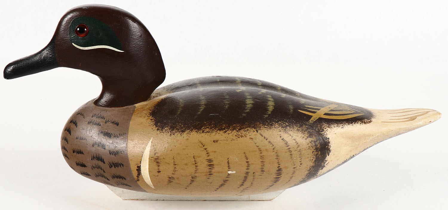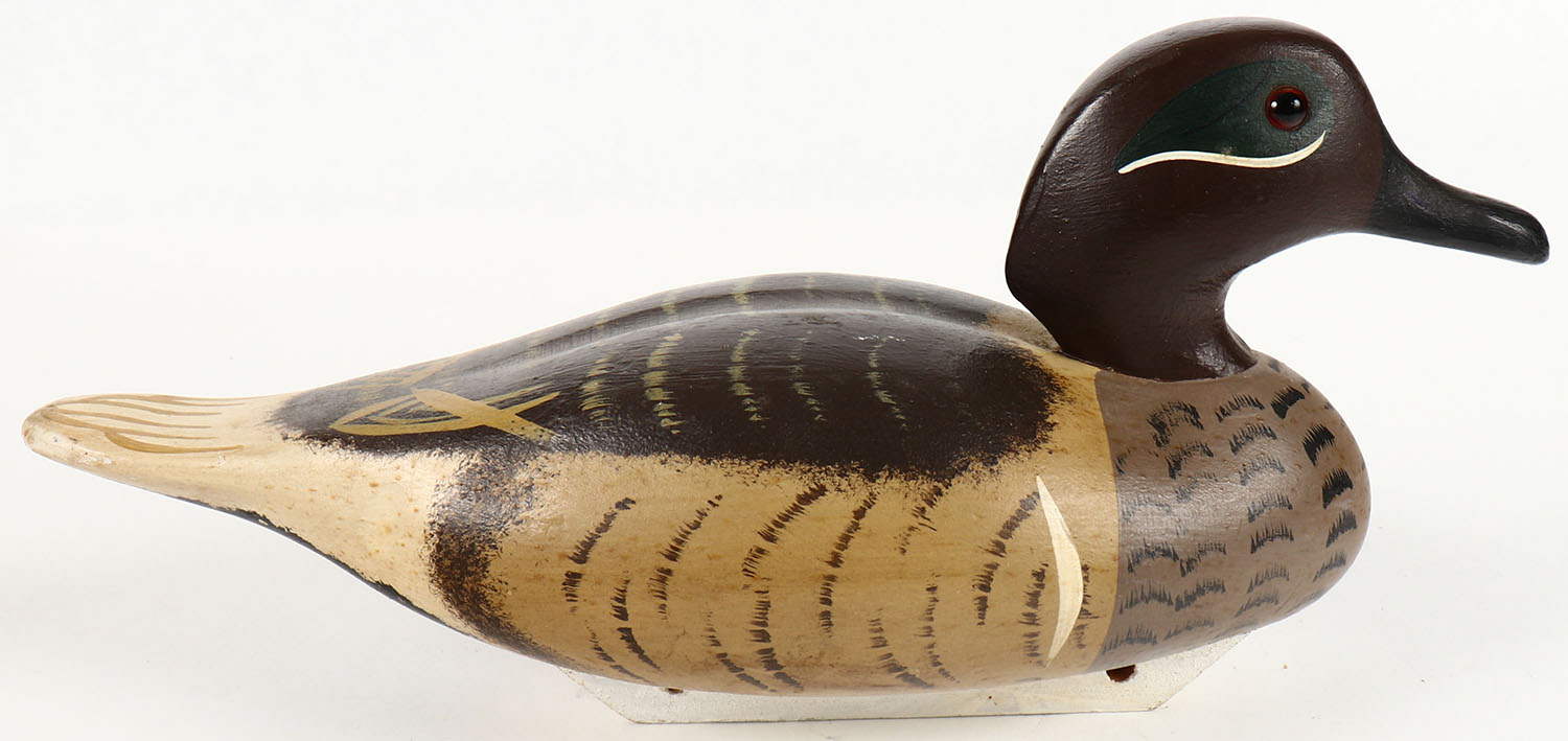 Greenwing Teal Drake by Ed Green, GE, solid wood, original paint, structurally excellent, signed on bottom, 12'' OAL. Grade: Excellent + - Value: 20 to 50
