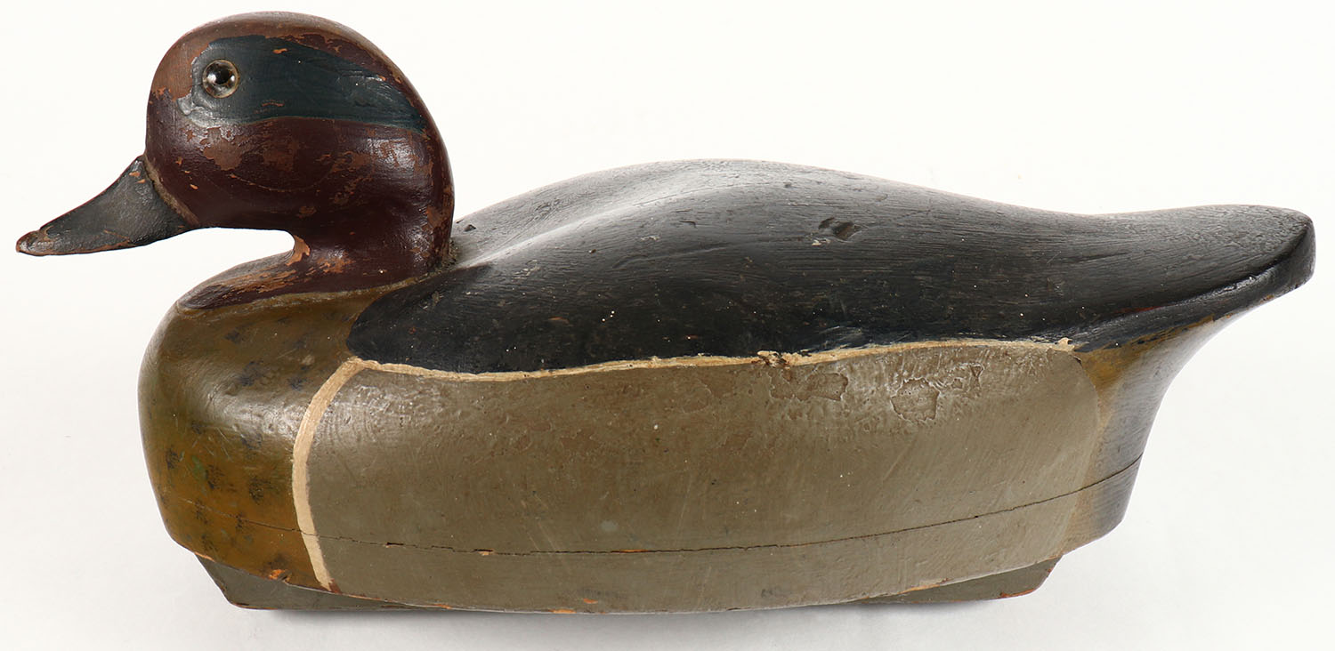 Greenwing Teal Drake by Wildfowler Decoy Co. Quogue, Long Island NY, GE, hollow wood, orignal paint, stamped on bottom. Grade: Excellent - Value: 50 to 150