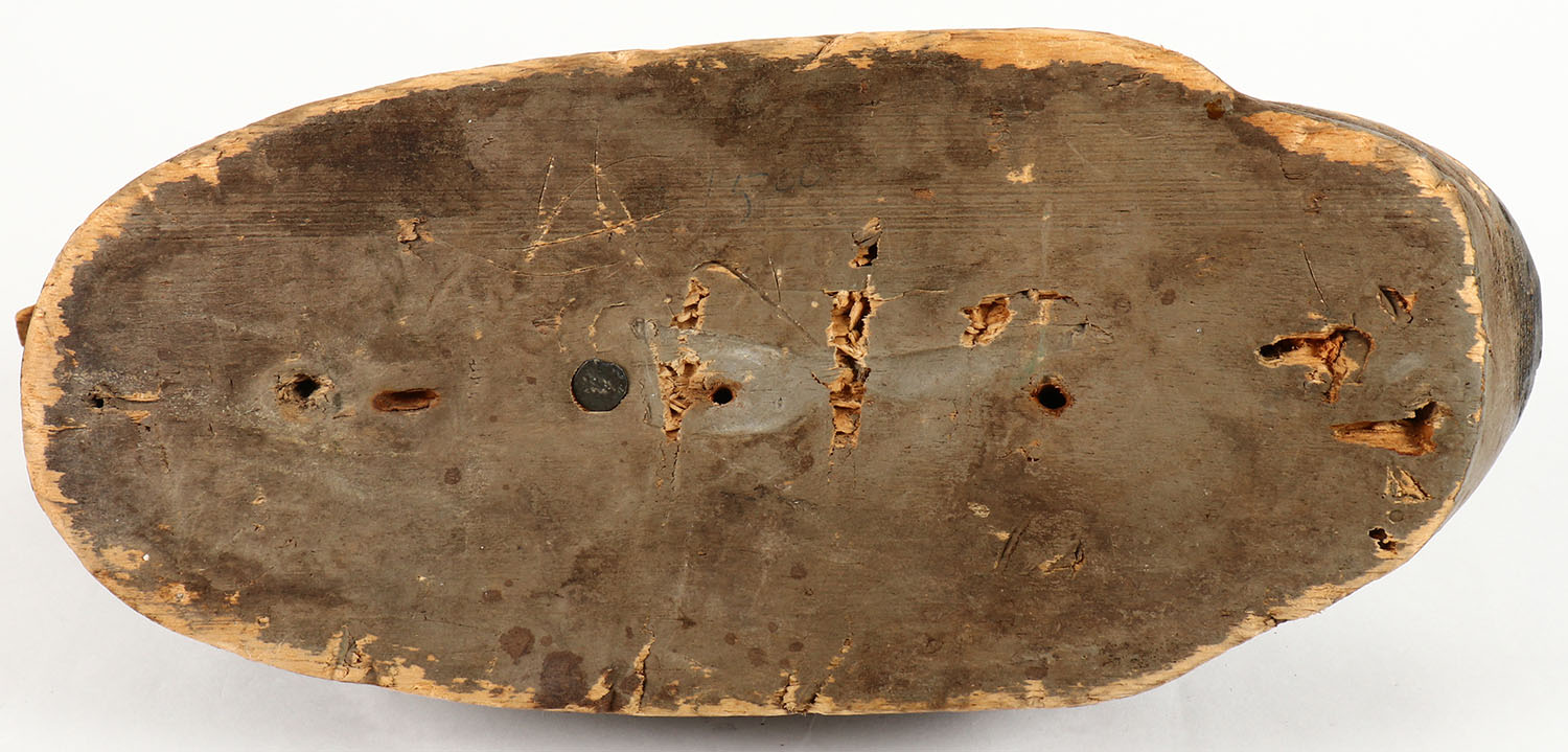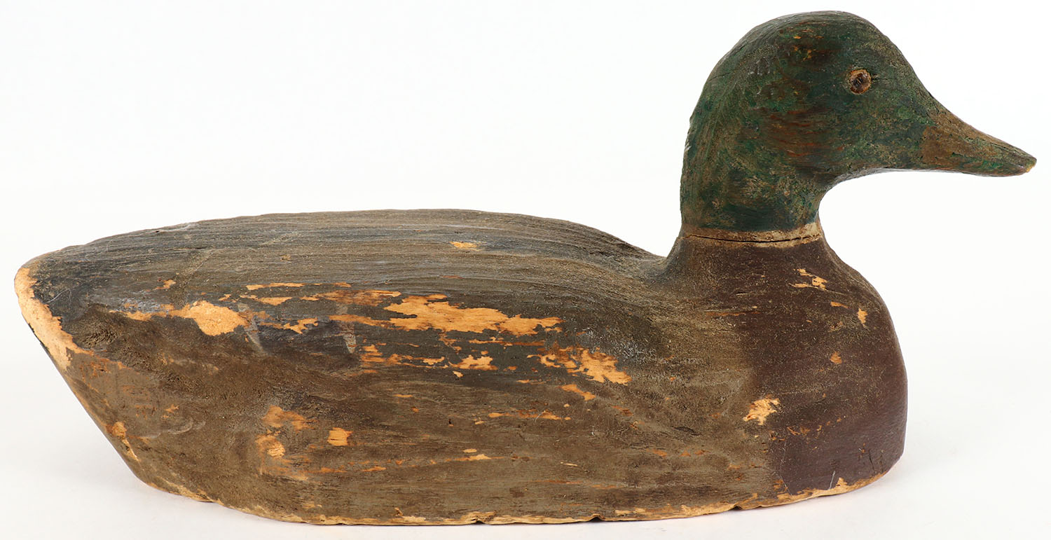Mallard Drake by Herter's???, GE, balsa wood, original paint shows wear with chip to tip of bill, structurally excellent, 13'' OAL. Grade: Very Good + - Value: 10 to 40