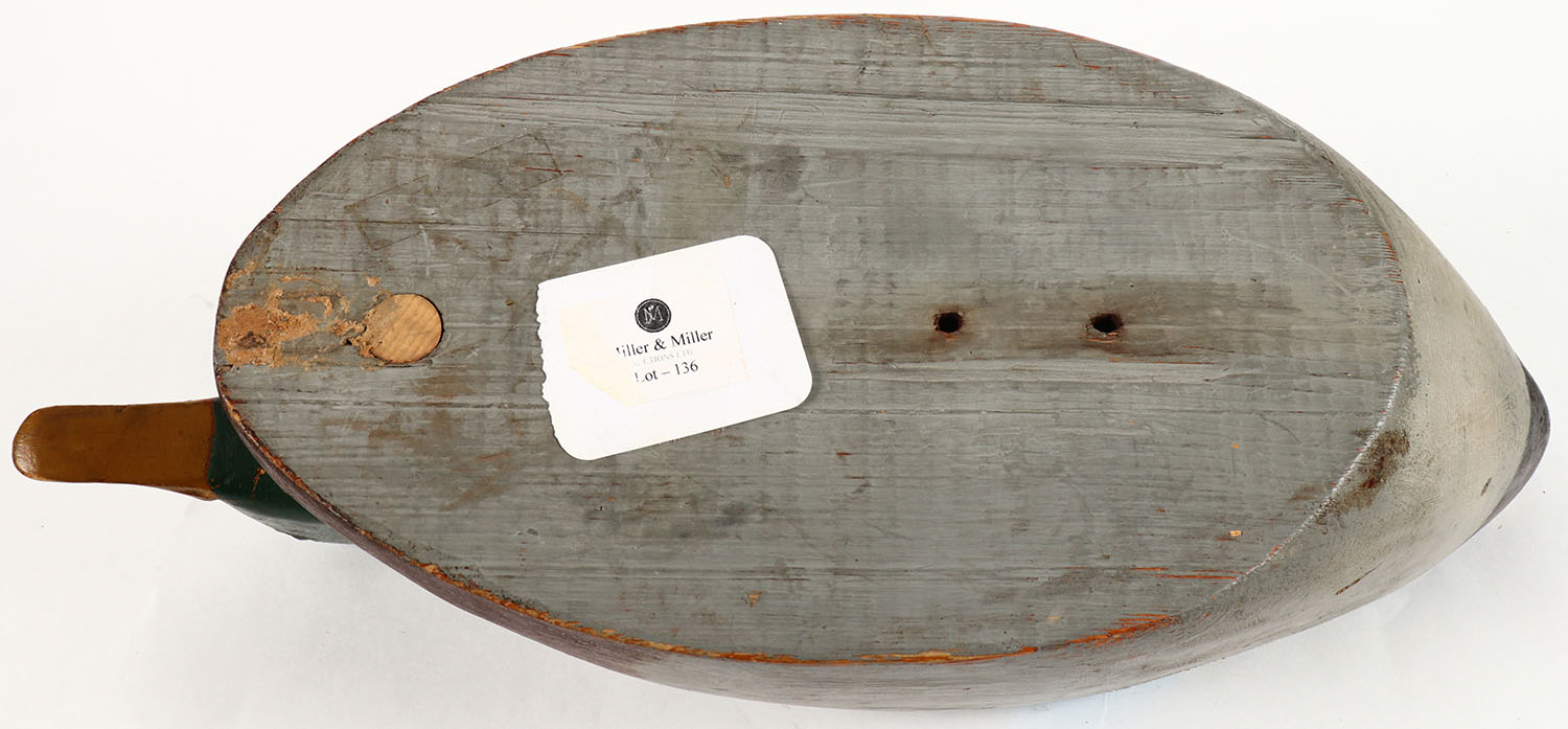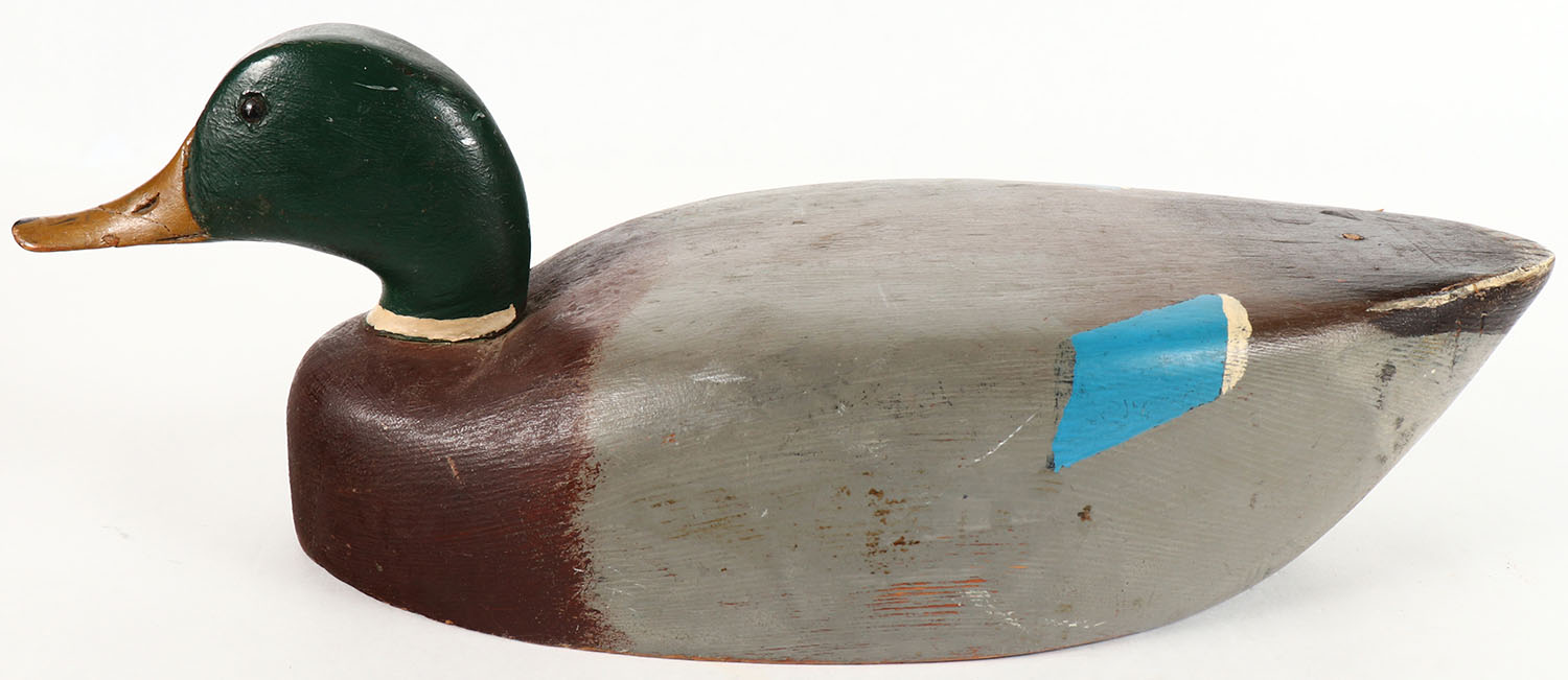Mallard Drake by unknown maker, GE, solid wood, original paint, bill has repaired crack, 16 1/2'' OAL. Grade: Very Good ++ - Value: 20 to 40