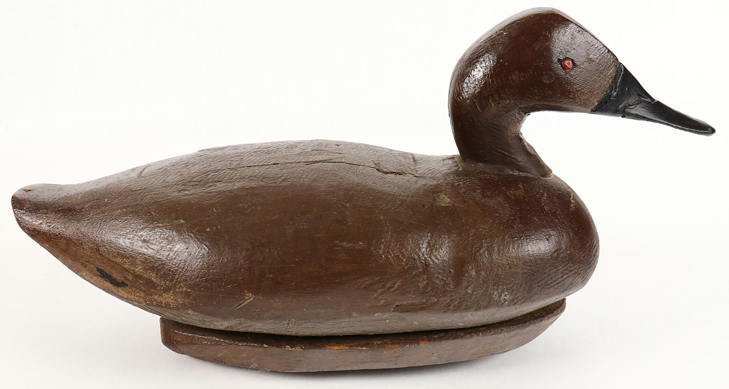 Canvasback Hen by unknown maker, PE, solid wood, old repaint, has hair line crack in neck, 15'' OAL. Grade: Excellent - Value: 20 to 40