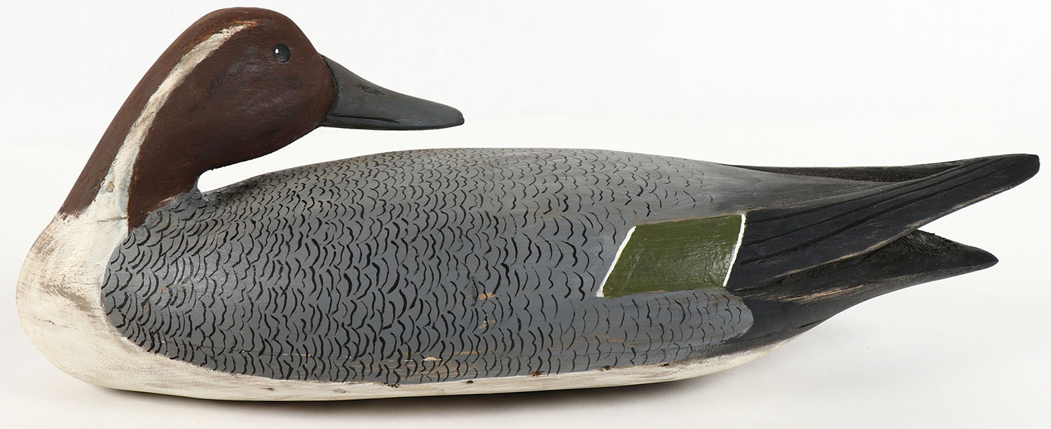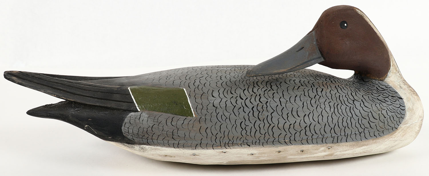 Preening Pintail Drake by unknown maker, PE, hollow wood, orignal paint, structurally excellent, 15'' OAL,. Grade: Excellent - Value: 20 to 40