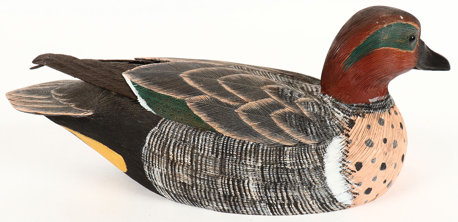 Greenwing Teal Drake by Tricia Veasey, GE, solid wood, original paint, structurally excellent, wonderful feather detail & wing relief. Grade: Excellent ++ - Value: 20 to 40