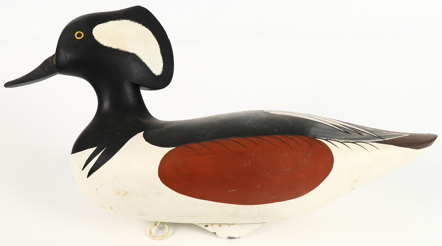 Hooded Merganser by Patrick ''Pat'' Vincent, Churchville, MD, painted eyes, solid wood, original paint, structurally excellent, signed on bottom, 14 1/2'' OAL. Grade: Excellent ++ - Value: 50 to 100