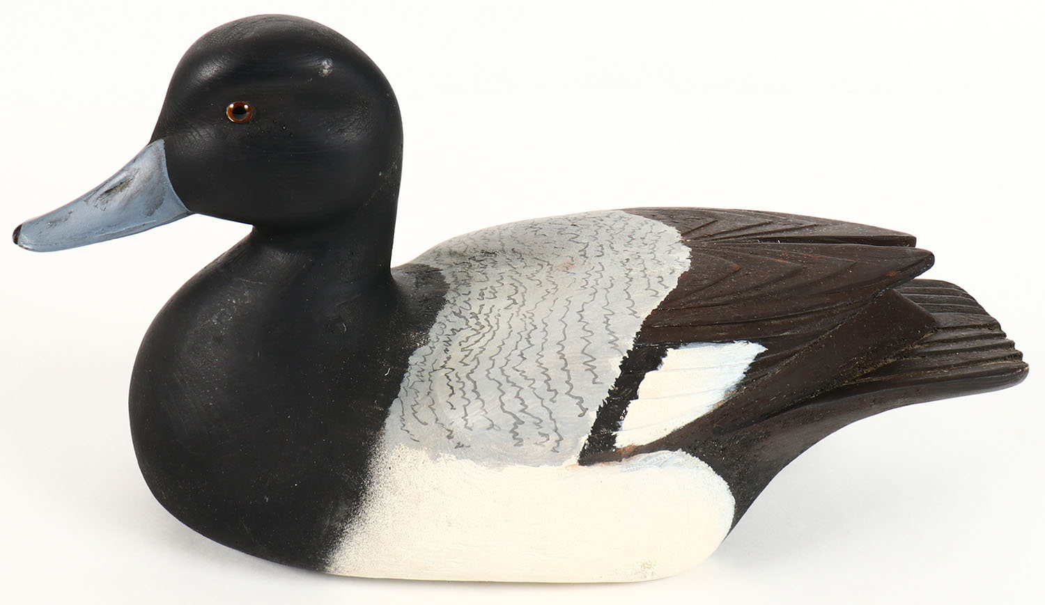 Bluebill Drake by Dan Heuer, Sault STE, Marie MI, glass eyes, solid wood, original paint, structurally excellent, also signed SSM, 13 1/2'' OAL. Grade: Excellent ++ - Value: 100 to 500