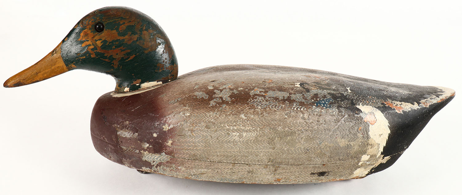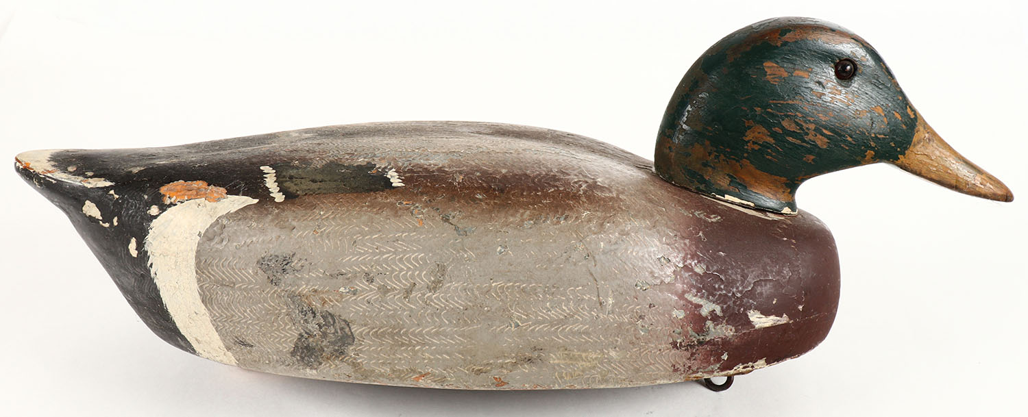 Mallard Drake by Wildfowler Decoy Co., GE solid wood, orignal paint show wear, 17 1/2'' OAL. Grade: Very Good - Value: 20 to 50