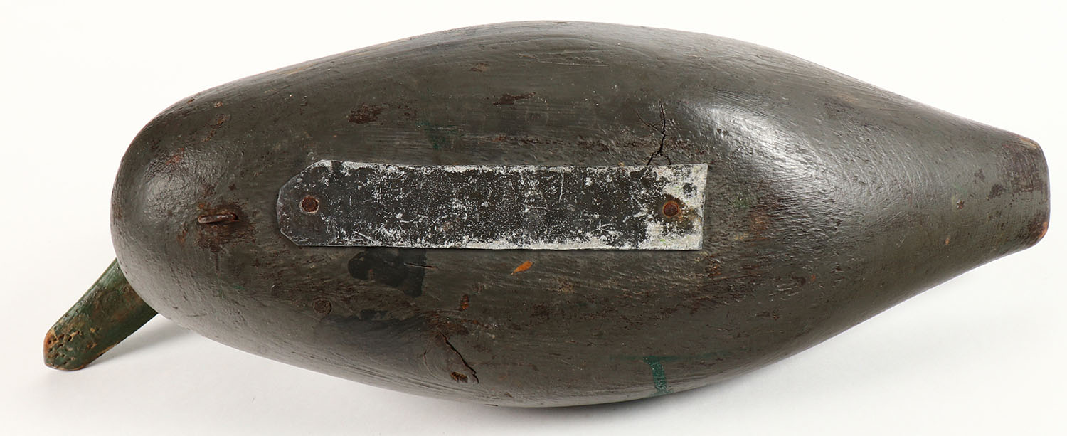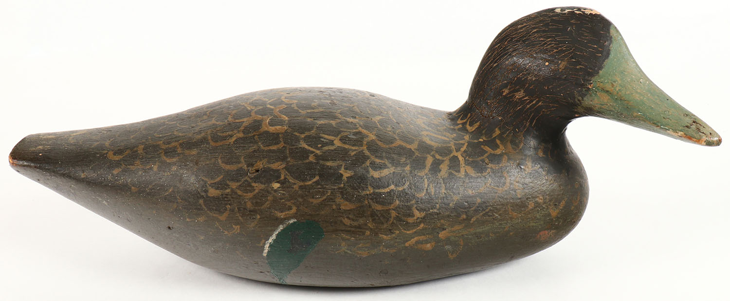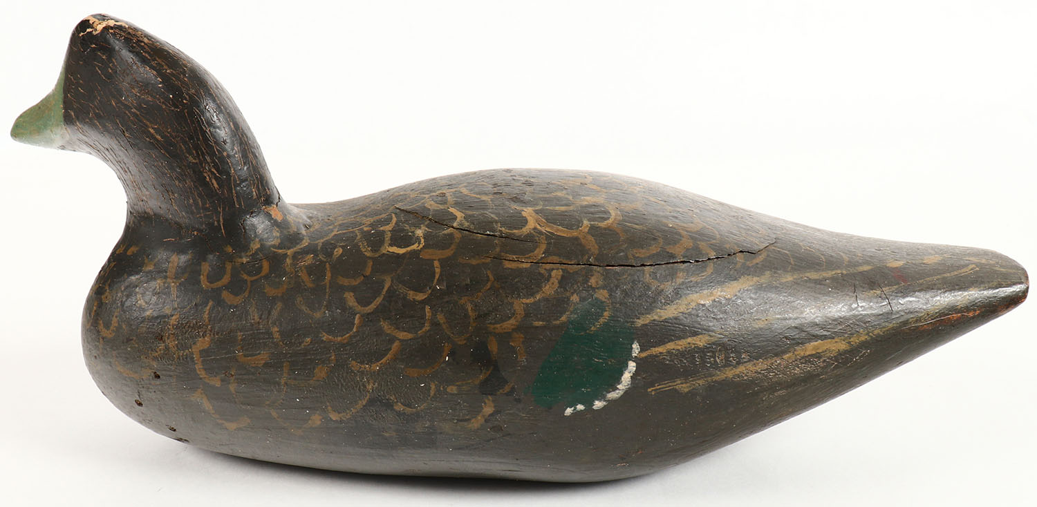 Black Duck by unknown maker, no eyes, solid wood, original paint, structurally excellent, 15 1/2'' OAL. Grade: Excellent - Value: 20 to 40