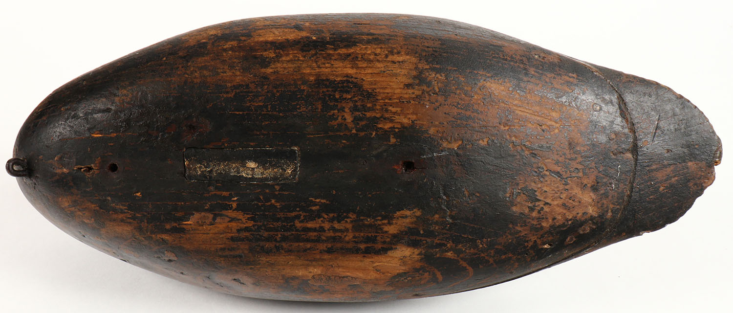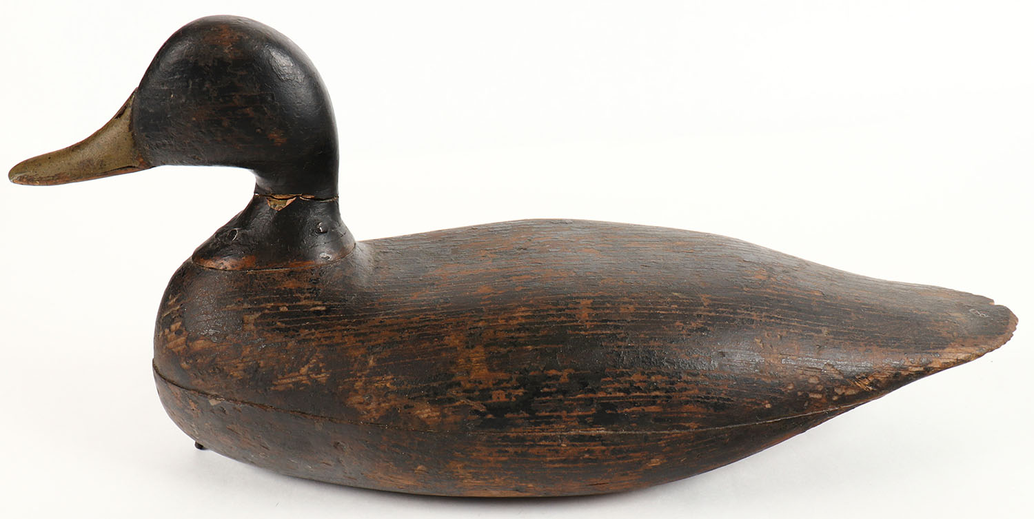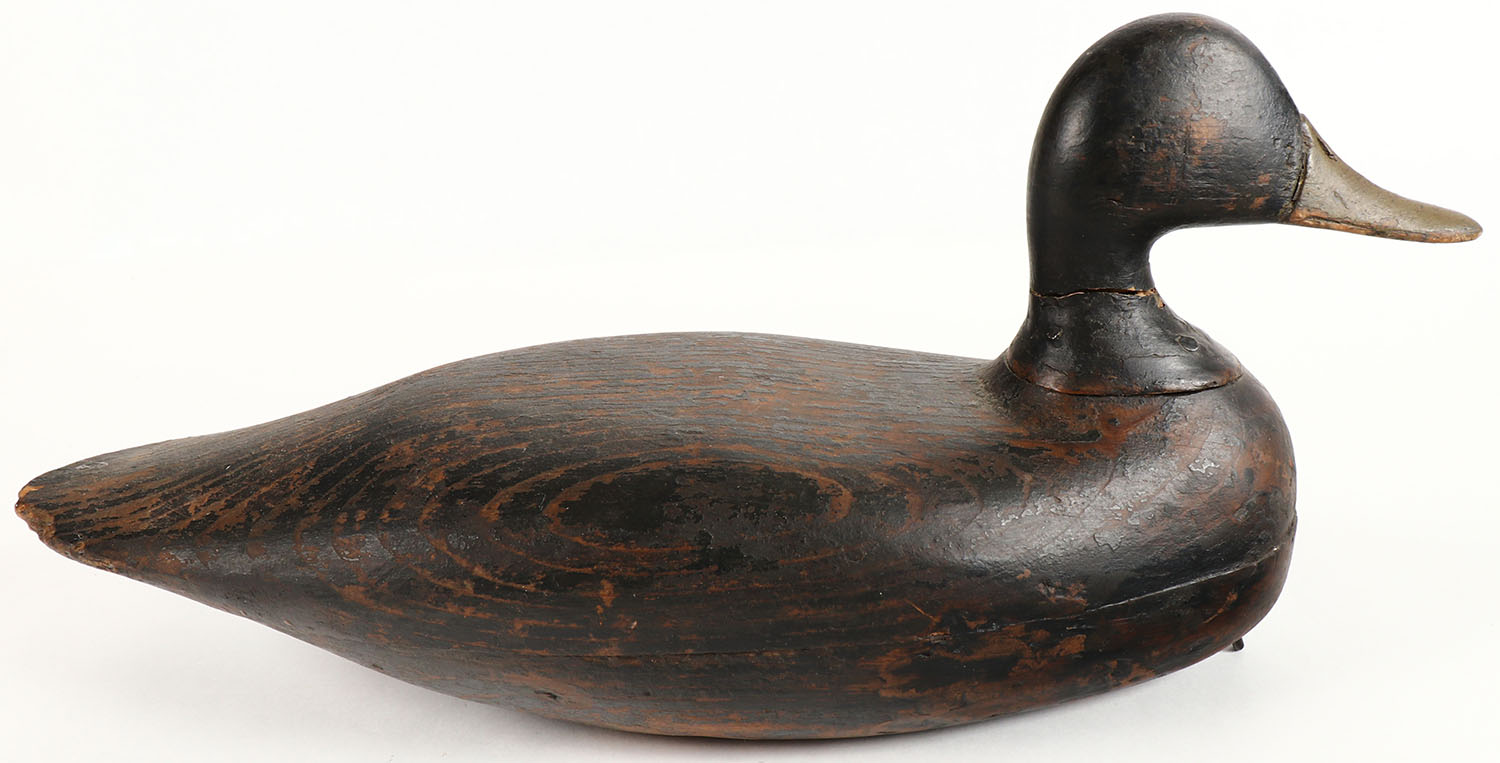 Black Duck by unknown NJ maker, no eyes, hollow wood, original paint shows wear with old repair & touch up to neck, structurally excellent, 15 1/2'' OAL. Grade: Excellent - Value: 70 to 150