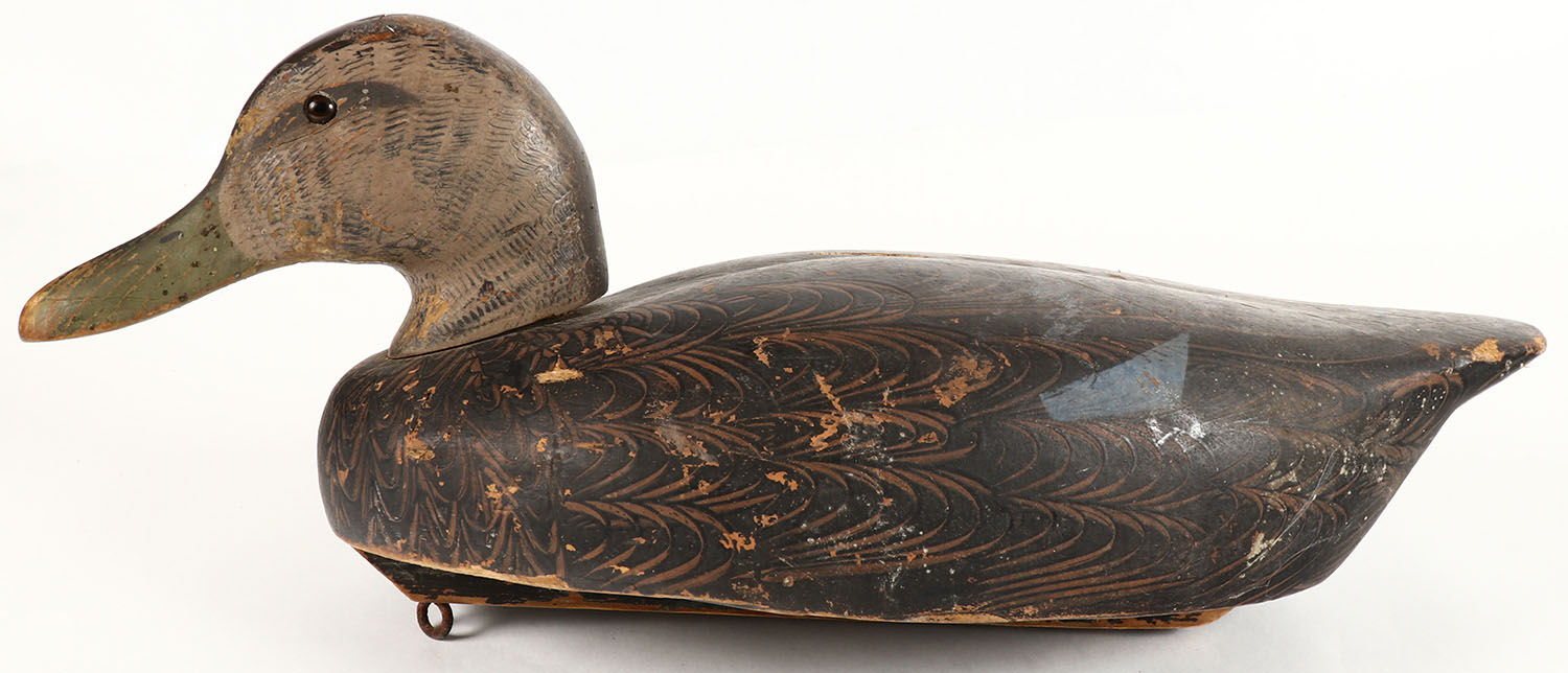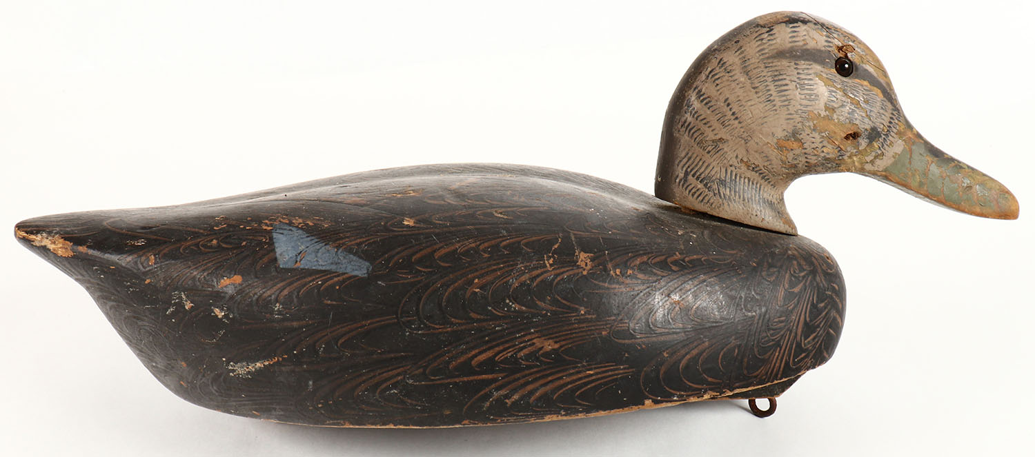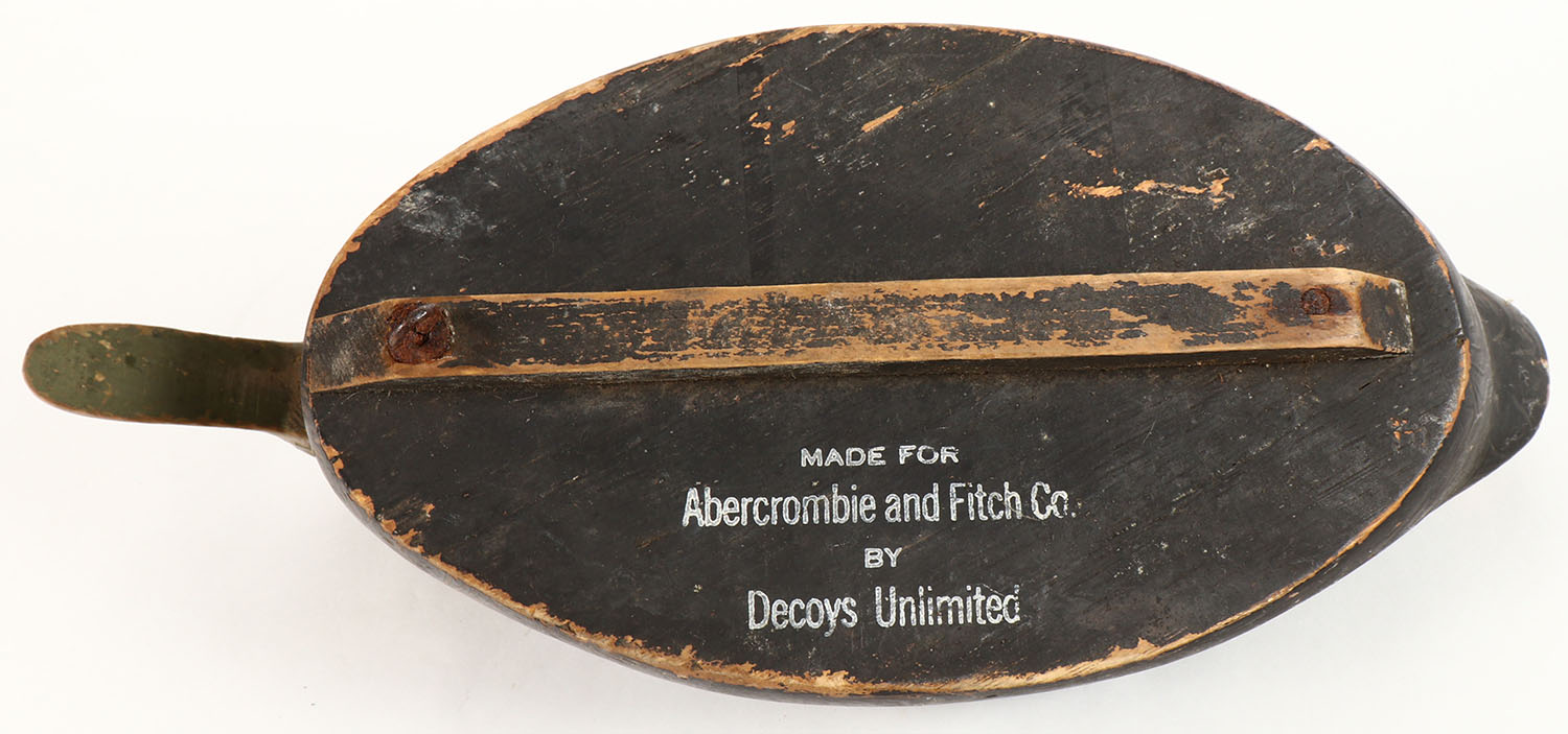 Black Duck by Decoys Unlimited for ABERCROMBIE & FITCH Co., PE, hollow wood, original paint, structurally excellent, 17'' OAL. Grade: Excellent - Value: 50 to 150