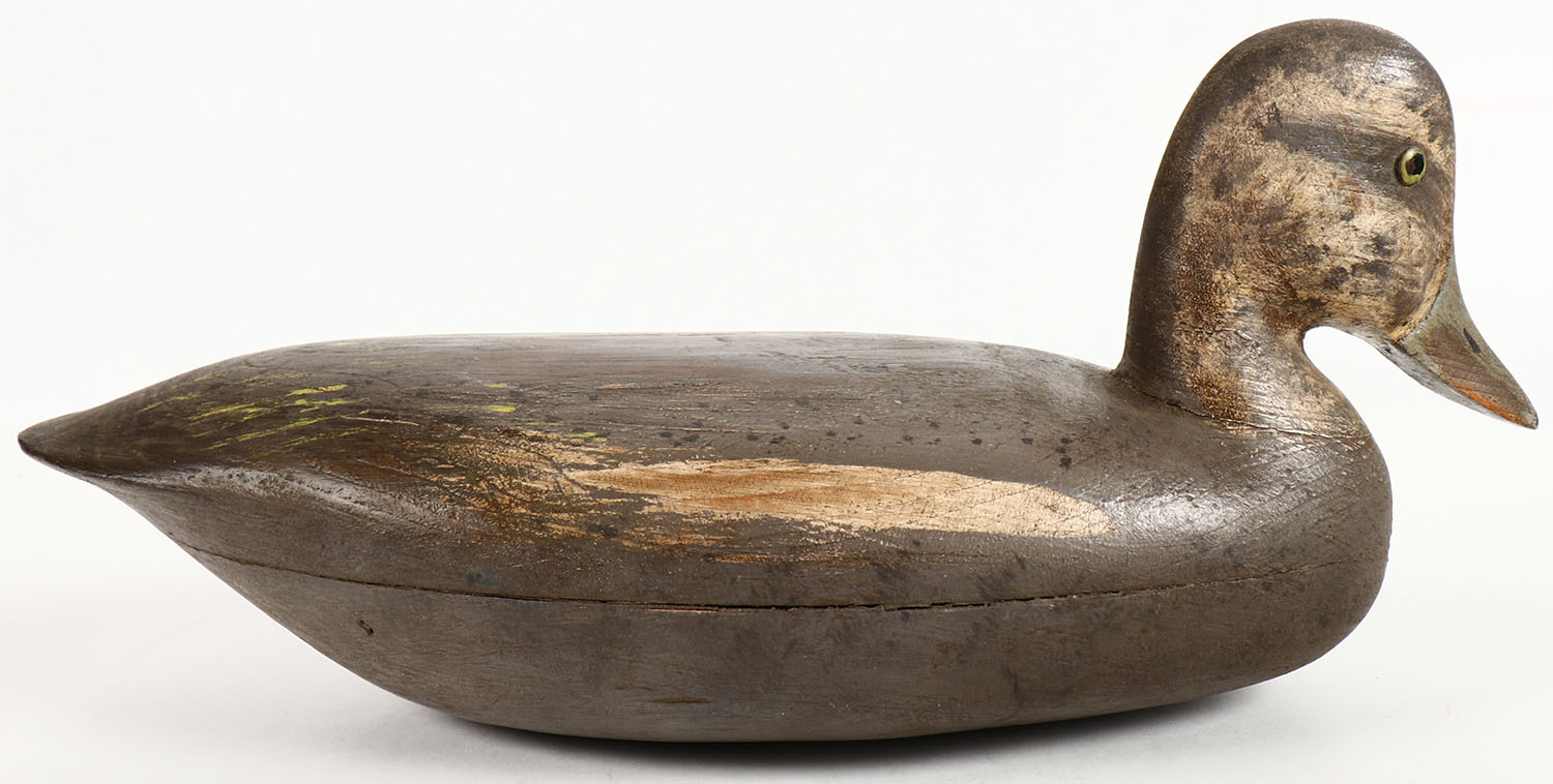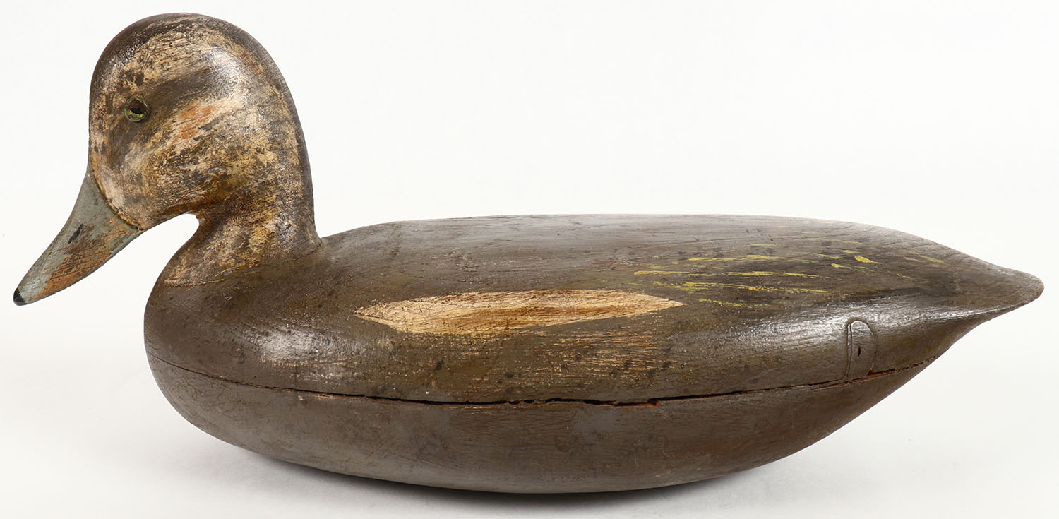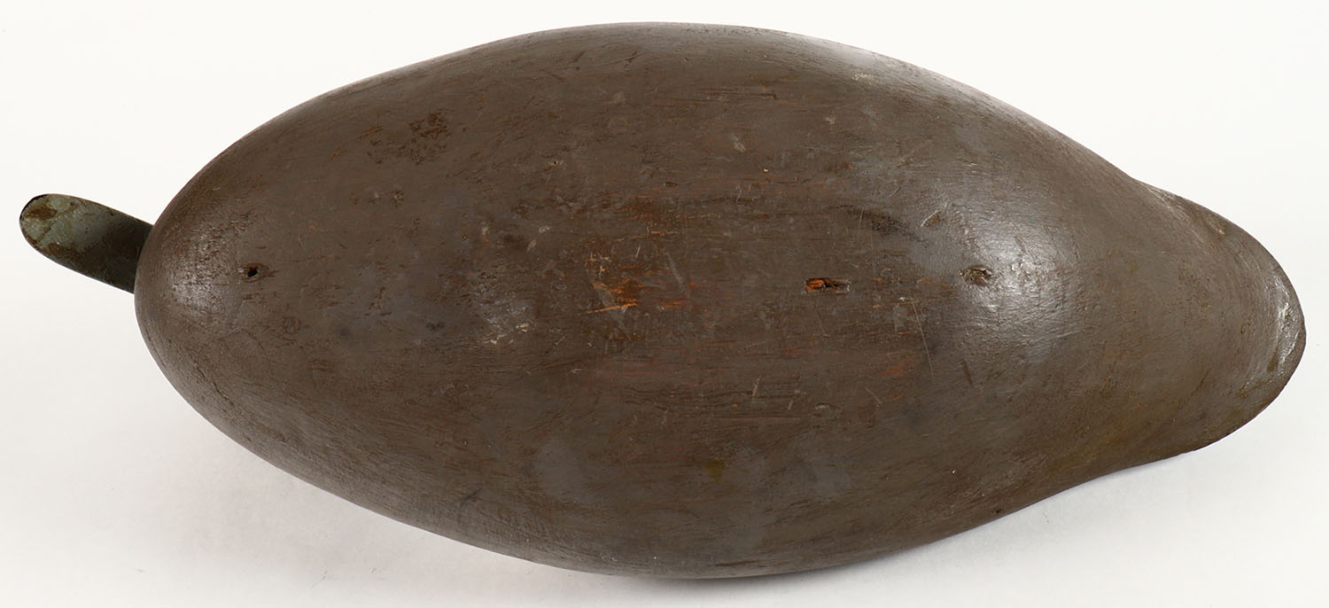 Widgeon Hen by unknown maker, TE, hollow wood, original paint, has age crack between the 2pc body, drake is in the next lot, 14'' OAL. Grade: Very Good ++ - Value: 20 to 40